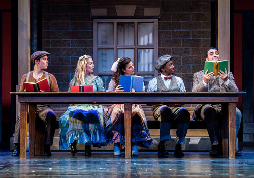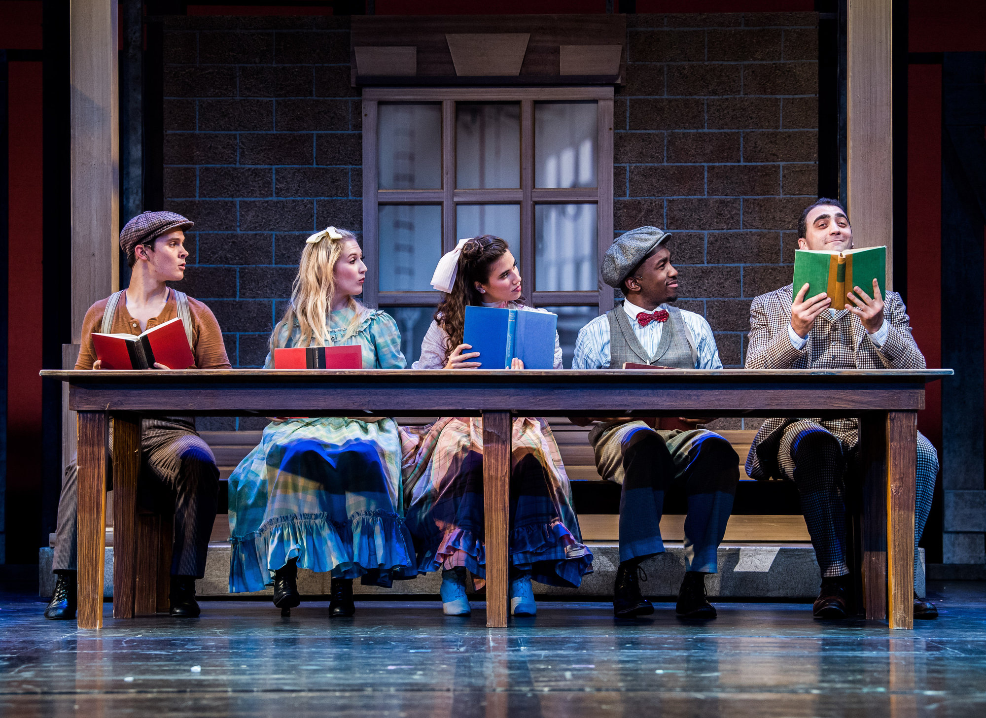 The teens of River City (actors from l to r Andrew Nelin, Claire Soulier, Ally Carboner and Jahir Hipps) listen to Harold (actor, Alex Syiek*) as he attempts to woo Marian the librarian in the Great Lakes Theater production THE MUSIC MAN at the Hanna Theatre, Playhouse Square which runs through November 10. (Photo by Ken Blaze)
