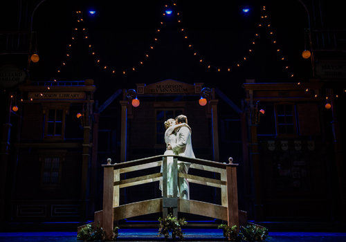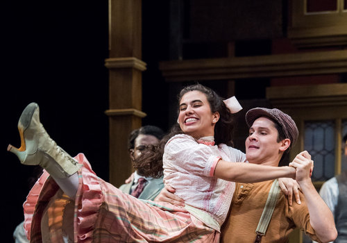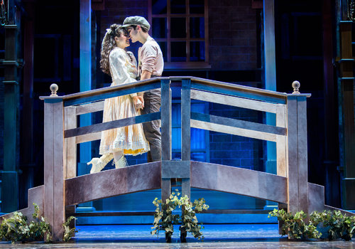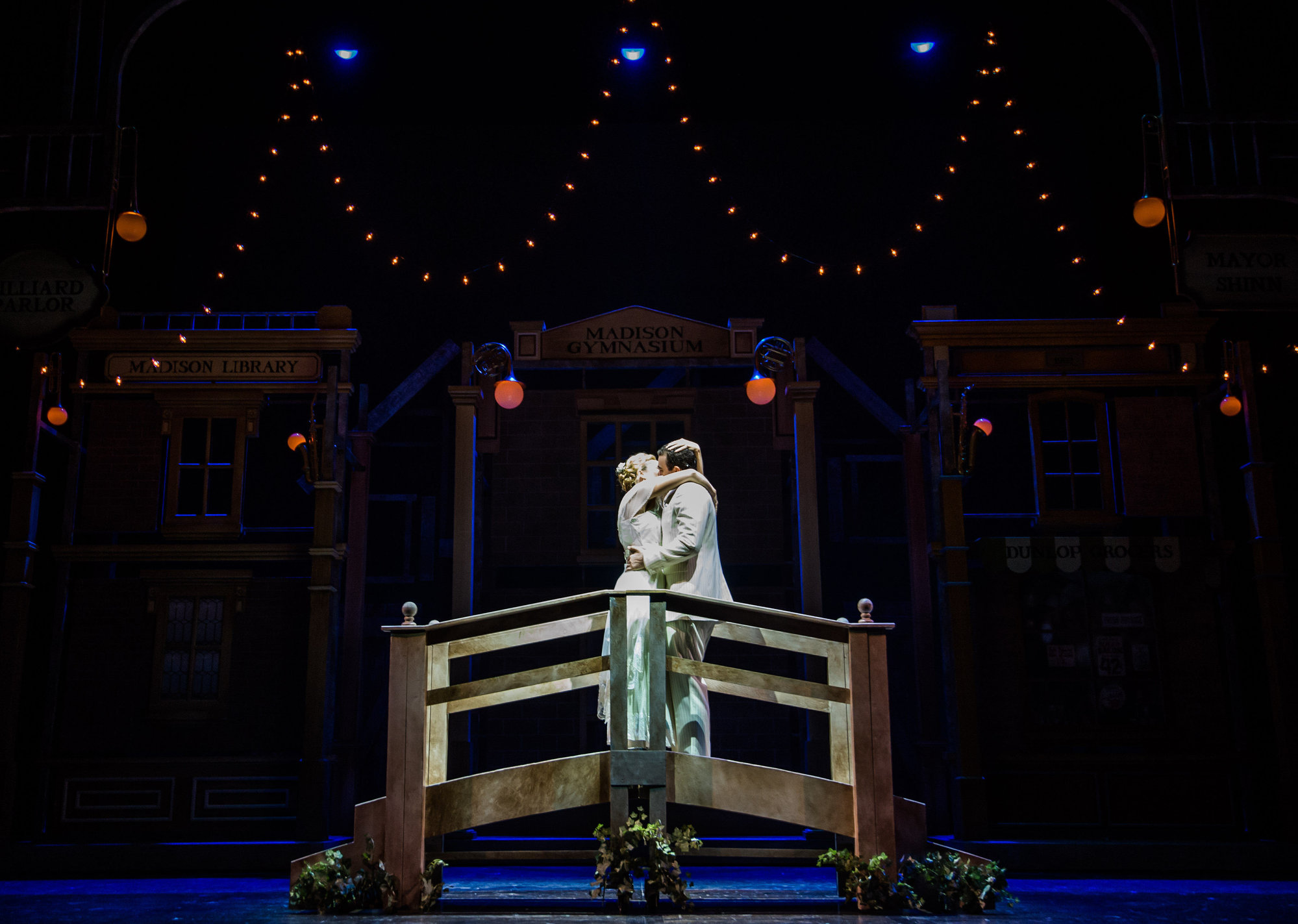 Zeneeta (actor, Ally Carboner) and Tommy (actor, Andrew Nelin) share a moment on the footbridge in the Great Lakes Theater production THE MUSIC MAN at the Hanna Theatre, Playhouse Square which runs through November 10. (Photo by Ken Blaze)