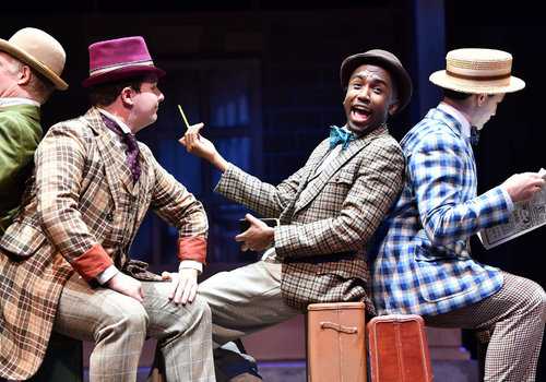 One traveling salesmen (actor, Jahir Hipps) talks shop with another (actor, Boe Wank*) as others listen (actors (l) David Antony Smith* & Alex Syiek*) in the Great Lakes Theater production of THE MUSIC MAN at the Hanna Theatre, Playhouse Square which runs through November 10. (Photo by Ken Blaze)