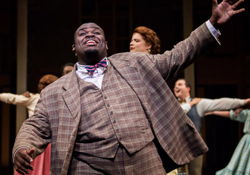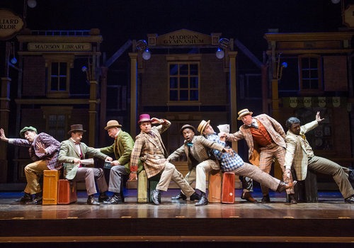 Marcellus (actor, Marcus Martin*) shows the citizens how to “Shi-poo-pi” in the Great Lakes Theater production THE MUSIC MAN at the Hanna Theatre, Playhouse Square which runs through November 10. (Photo by Ken Blaze)
