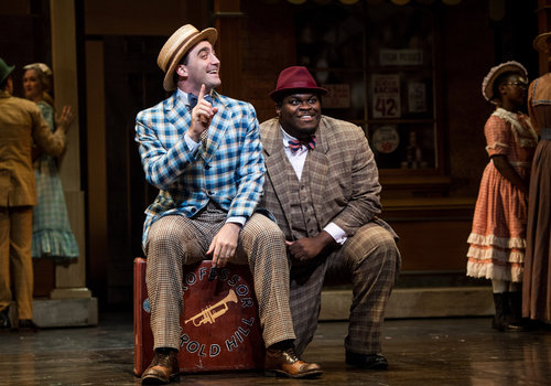 Harold Hill (actor, Alex Syiek*) meets up with old friend Marcellus Washburn (actor, Marcus Martin*) in the Great Lakes Theater production of THE MUSIC MAN at the Hanna Theatre, Playhouse Square which runs through November 10. (Photo by Ken Blaze)