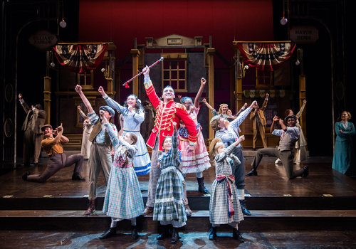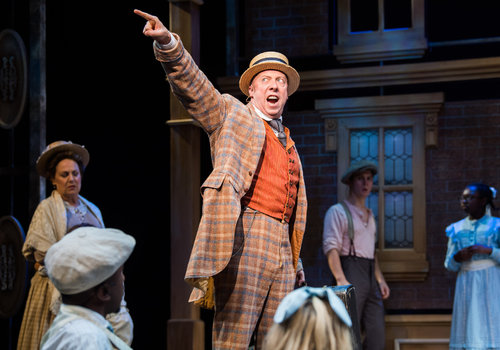 Harold (actor, Alex Syiek*) leads the River City kids (actors, Marlowe Miller, Owen Mills, Avery Pyo, Brenna Sherman, August Sumlin, Chase Christopher Zadd) in a rousing rendition of “76 Trombones” in the Great Lakes Theater production of THE MUSIC MAN at the Hanna Theatre, Playhouse Square which runs through November 10. (Photo by Ken Blaze)