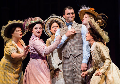 Harold (actor, Alex Syiek*) gets the gossip from the ladies of River City (actors from l to r, Shelby Griswold*, Laura Welsh Berg*, Jessie Cope Miller*, Erin Niebuhr and Jodi Dominick*) in the Great Lakes Theater production of THE MUSIC MAN at the Hanna Theatre, Playhouse Square which runs through November 10. (Photo by Ken Blaze)