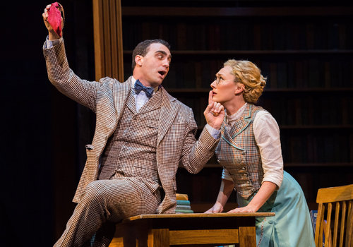 Harold (actor, Alex Syiek*) bends the ear of Marian (actor, Jillian Kates*) in the Great Lakes Theater production THE MUSIC MAN at the Hanna Theatre, Playhouse Square which runs through November 10. (Photo by Ken Blaze)