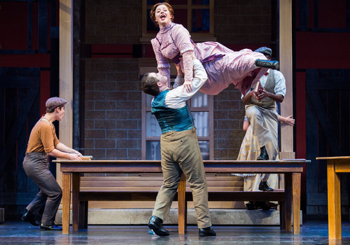 Alma Hix (actor, Laura Welsh Berg*) enjoys some high flying fun with assistance from Jacey Squires (actor, Boe Wank*) in the library in the Great Lakes Theater production of THE MUSIC MAN at the Hanna Theatre, Playhouse Square which runs through November 10 (Photo by Ken Blaze)