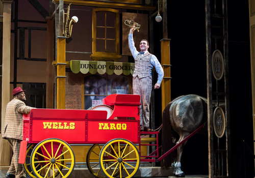 Marcellus (actor, Marcus Martin*) and Harold (actor, Alex Syiek*) present what the Wells Fargo Wagon brought for the citizens of River City in the Great Lakes Theater production THE MUSIC MAN at the Hanna Theatre, Playhouse Square which runs through November 10. (Photo by Ken Blaze)