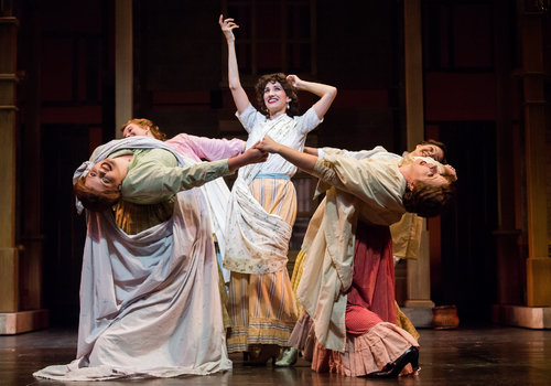 The ladies of River City (actors l to r, Shelby Griswold*, Erin Niebuhr, Jodi Dominick*, Jessie Cope Miller* and Laura Welsh Berg*) practice for their River City Sociable performance in the Great Lakes Theater production of THE MUSIC MAN at the Hanna Theatre, Playhouse Square which runs through November 10. (Photo by Ken Blaze)