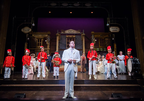 Harold (actor, Alex Syiek*) tells the citizens of River City of the virtues of a child’s band in the Great Lakes Theater production THE MUSIC MAN at the Hanna Theatre, Playhouse Square which runs through November 10. (Photo by Ken Blaze)