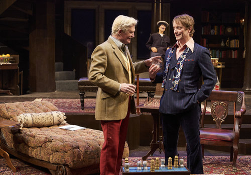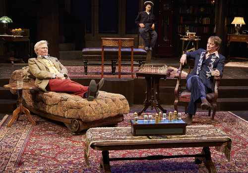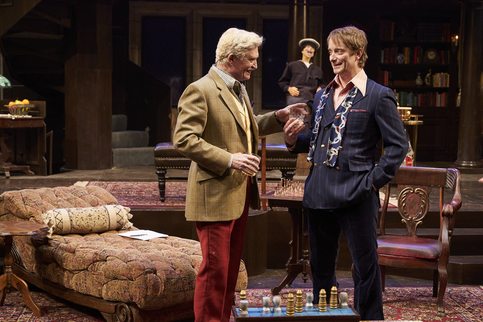 Milo (actor, Jeffrey C. Hawkins*) prepares to leave as Andrew (actor, David Anthony Smith*) looks on in the Great Lakes Theater production of SLEUTH onstage at the Hanna Theatre, Playhouse Square. The production runs through March 8. (Photography by Roger Mastroianni)