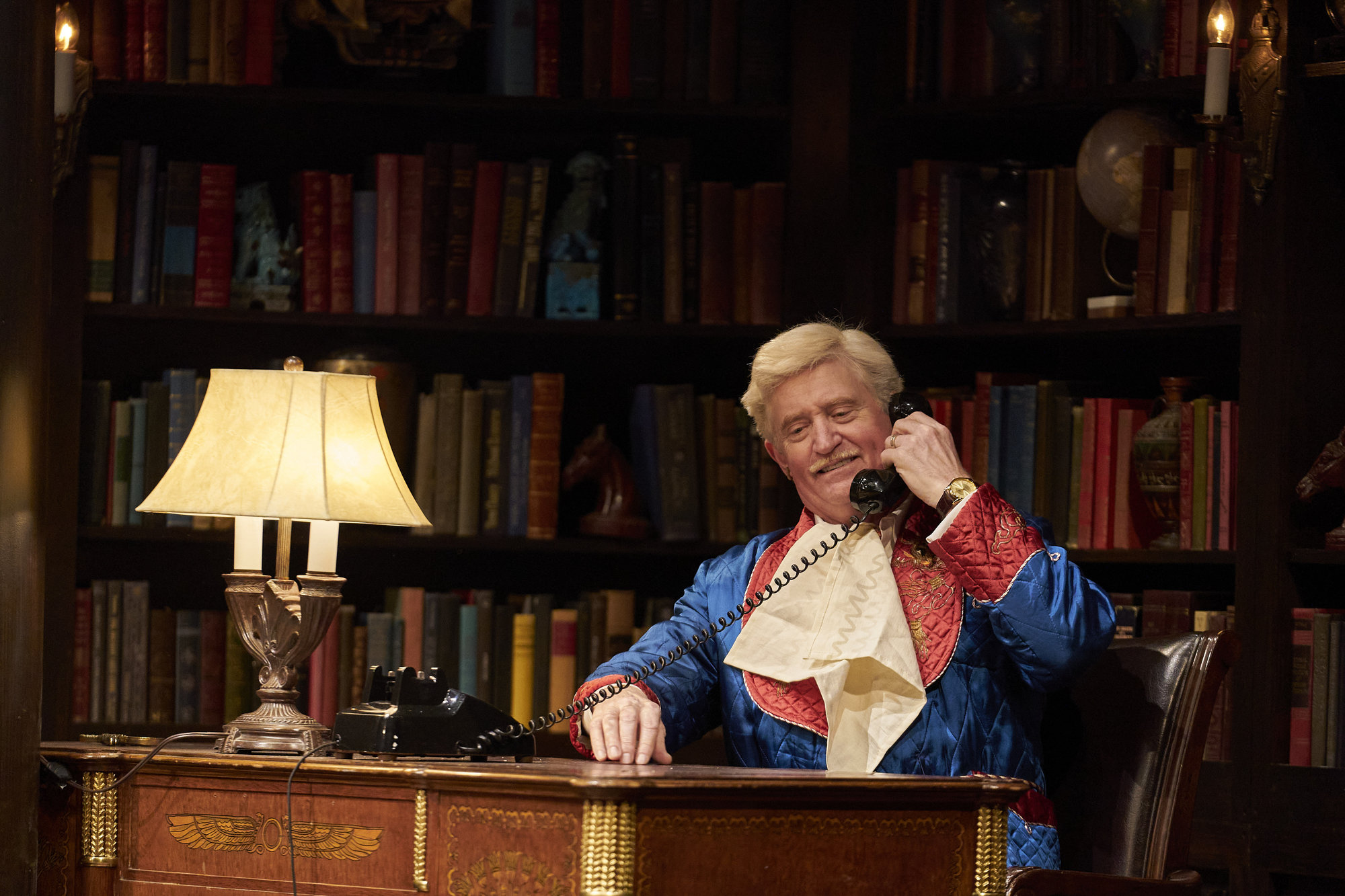 Andrew (actor, David Anthony Smith*) receives a call in the Great Lakes Theater production of SLEUTH onstage at the Hanna Theatre, Playhouse Square. The production runs through March 8. (Photography by Roger Mastroianni)