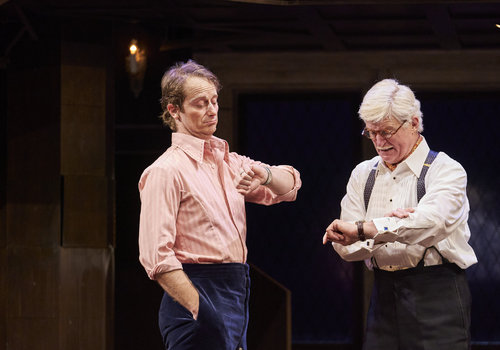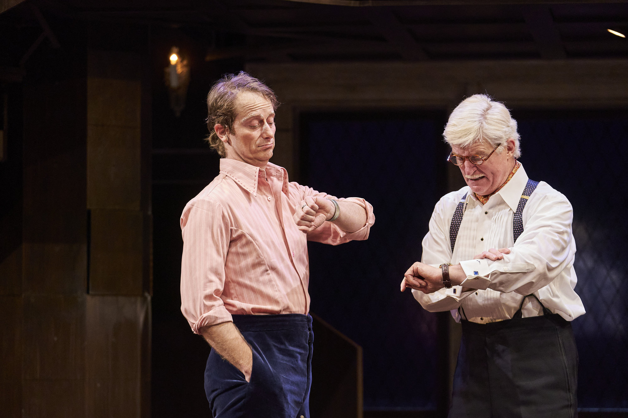 Andrew (actor, David Anthony Smith*) and Milo (actor, Jeffrey C. Hawkins*) check the limited time they have in the Great Lakes Theater production of SLEUTH onstage at the Hanna Theatre, Playhouse Square. The production runs through March 8. (Photography by Roger Mastroianni)