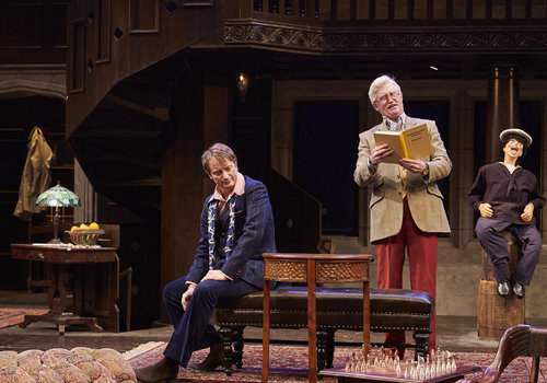 Andrew (actor, David Anthony Smith*) reads to Milo (actor, Jeffrey C. Hawkins*) from one of his mystery novels in the Great Lakes Theater production of SLEUTH onstage at the Hanna Theatre, Playhouse Square. The production runs through March 8. (Photography by Roger Mastroianni)