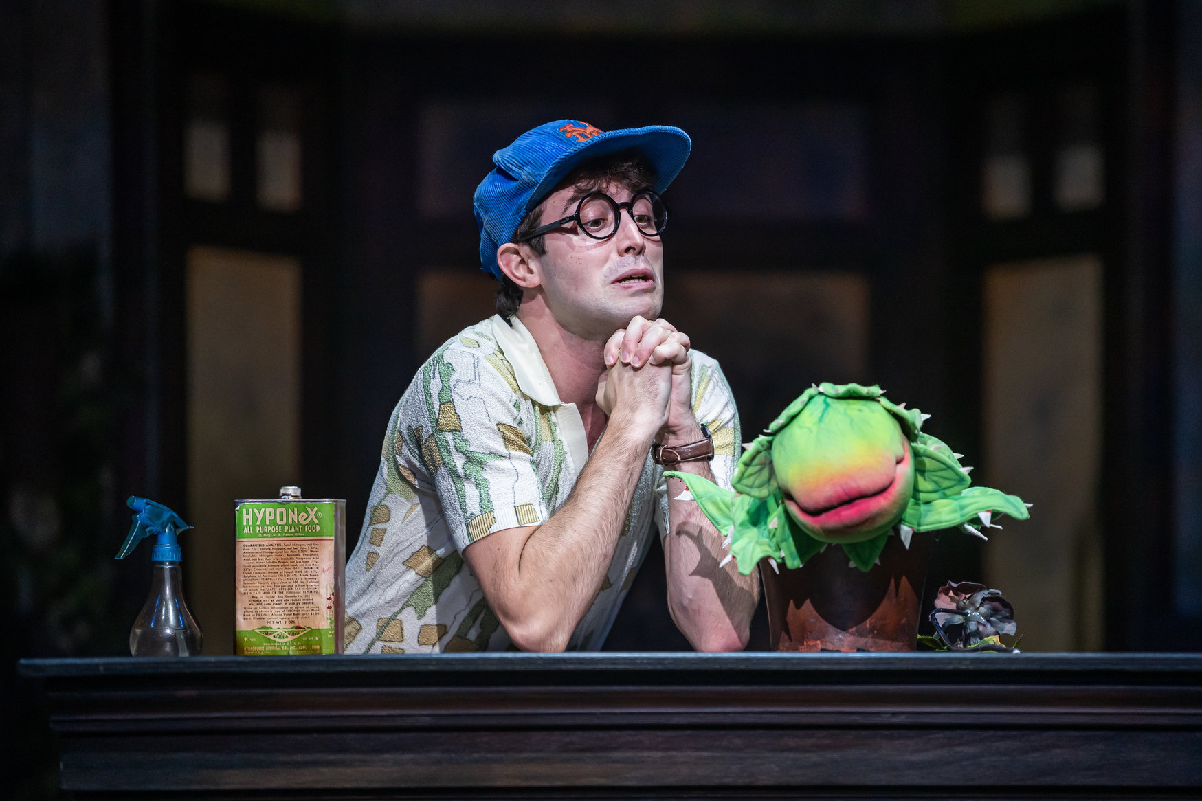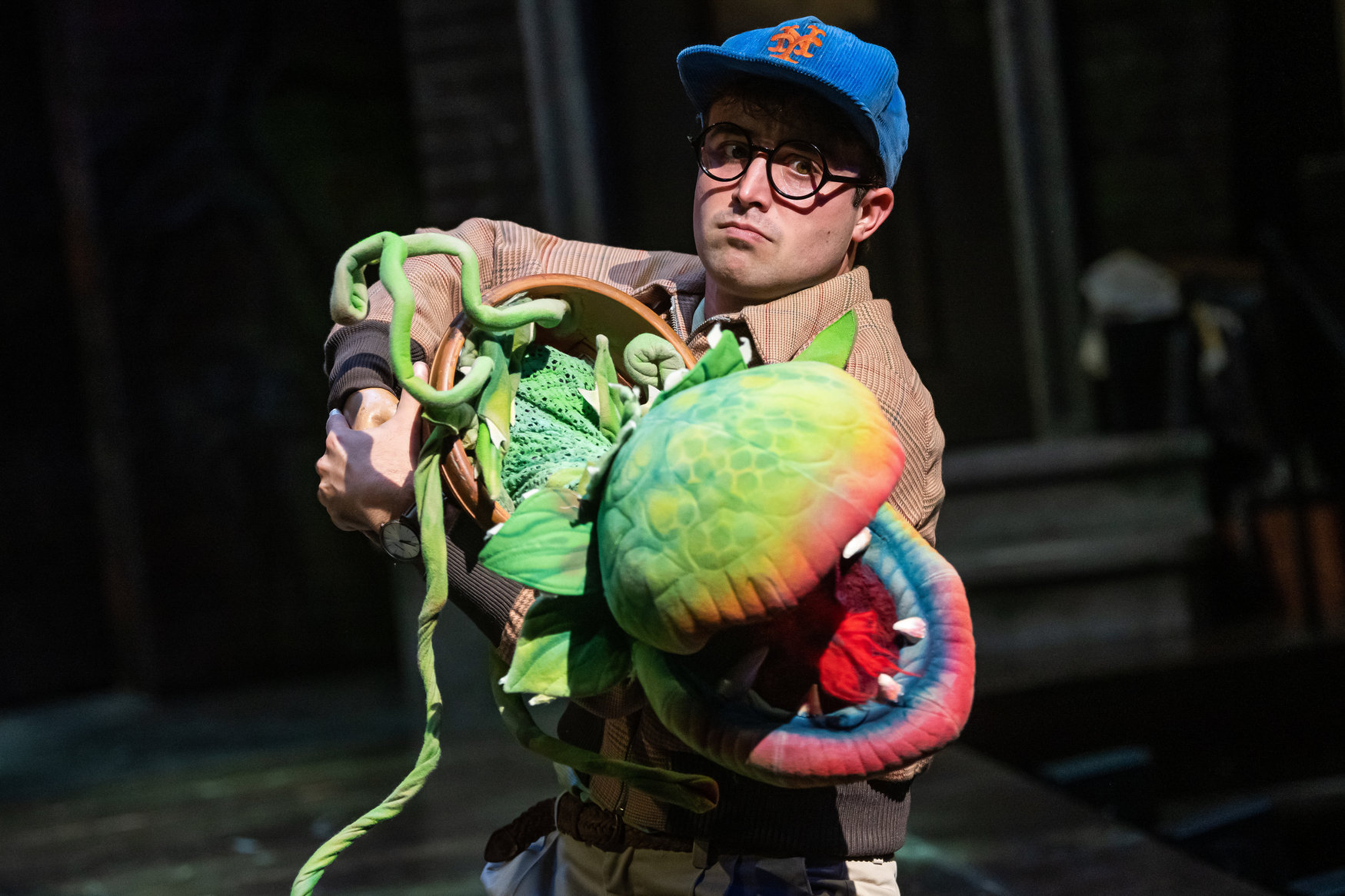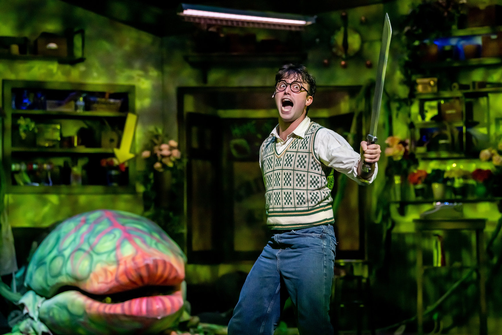 Seymour (actor, Andrew Faria*) takes action in the Great Lakes Theater production of LITTLE SHOP OF HORRORS at the Hanna Theatre, Playhouse Square running through October 9. (Photo by Ken Blaze)