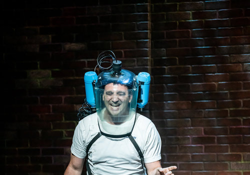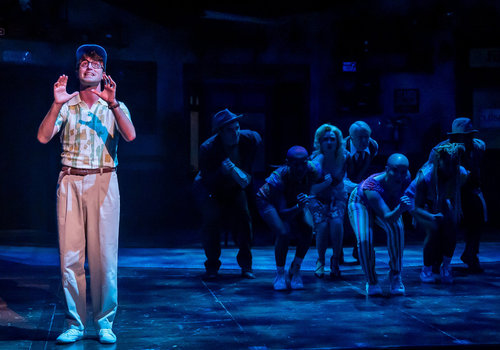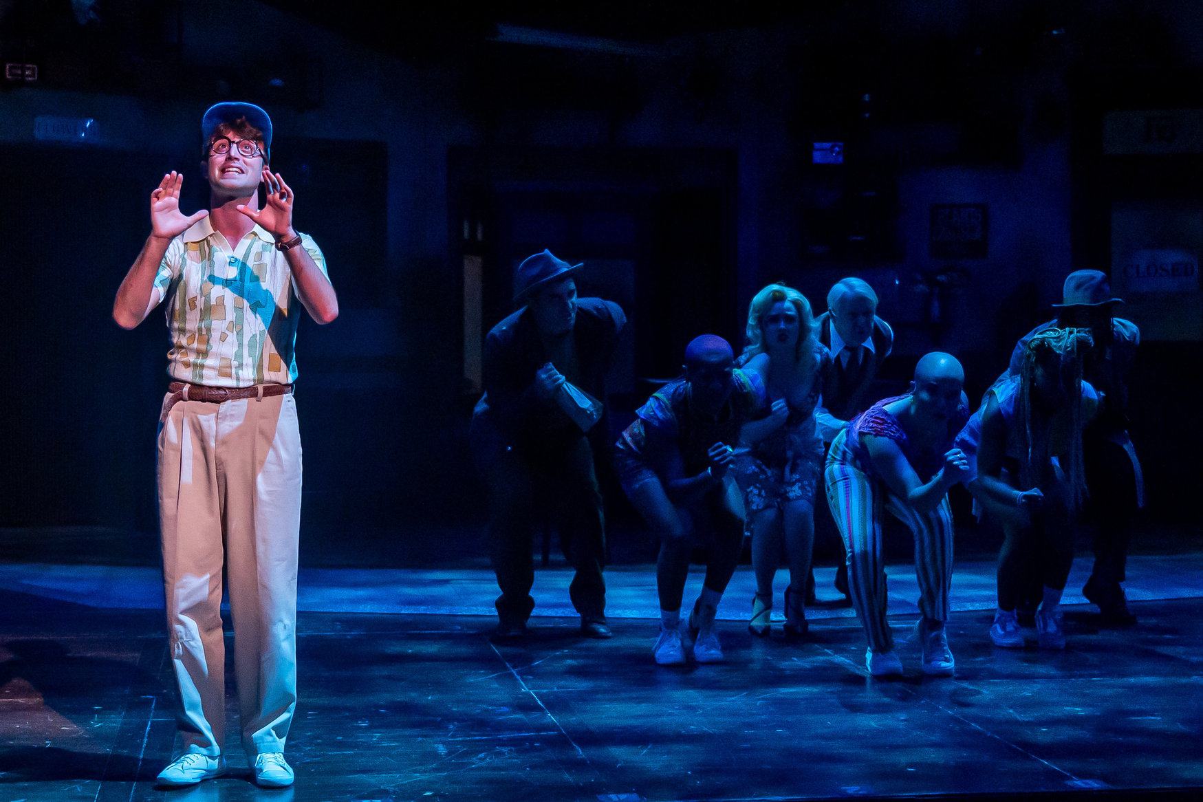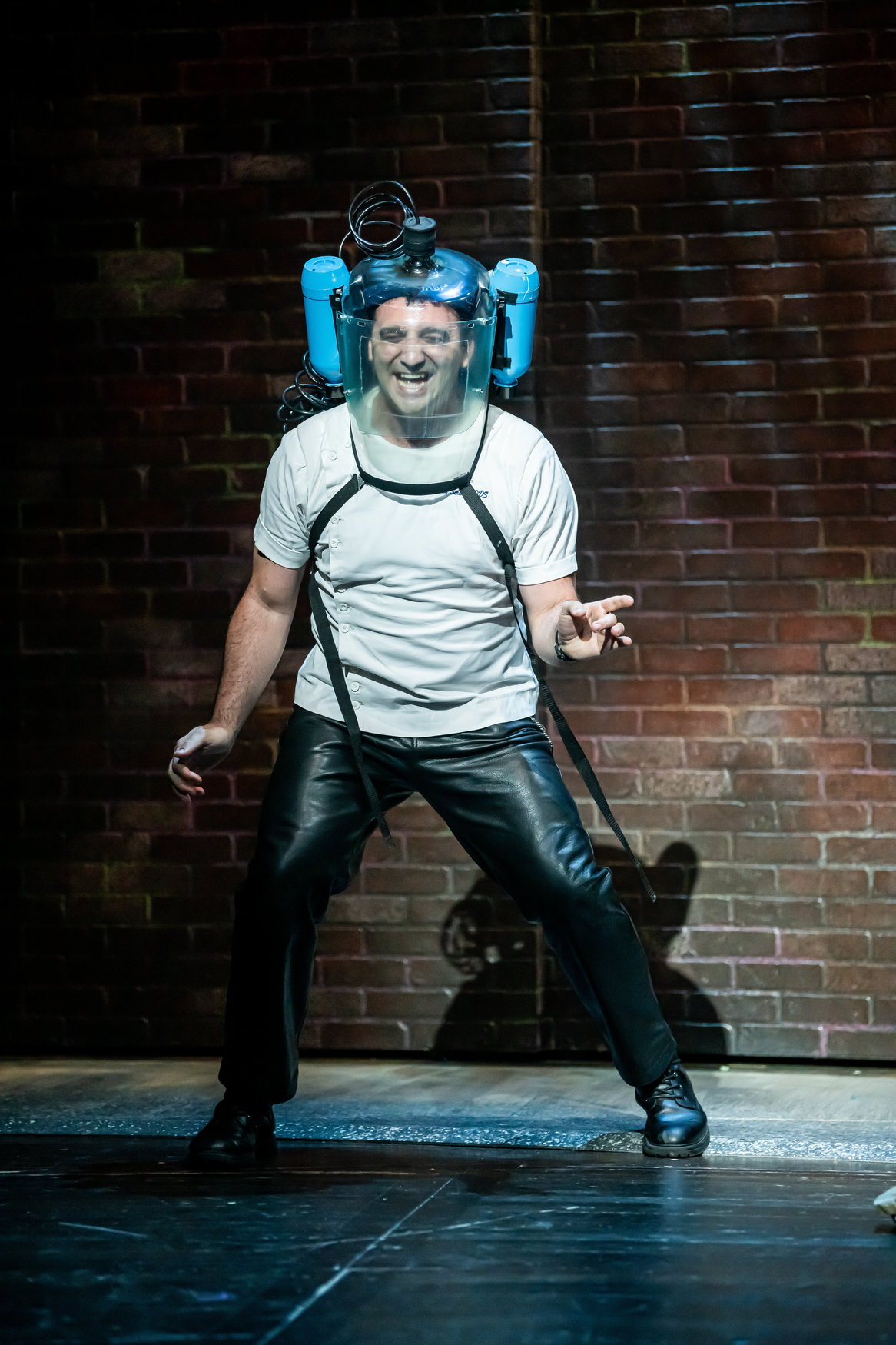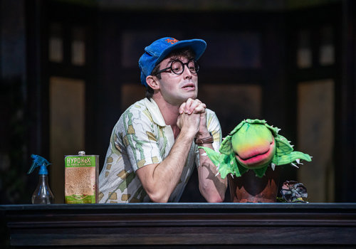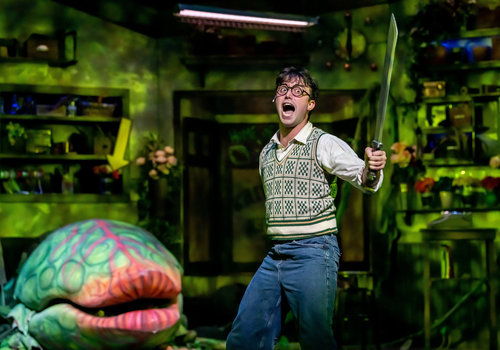 Seymour (actor, Andrew Faria*) takes action in the Great Lakes Theater production of LITTLE SHOP OF HORRORS at the Hanna Theatre, Playhouse Square running through October 9. (Photo by Ken Blaze)