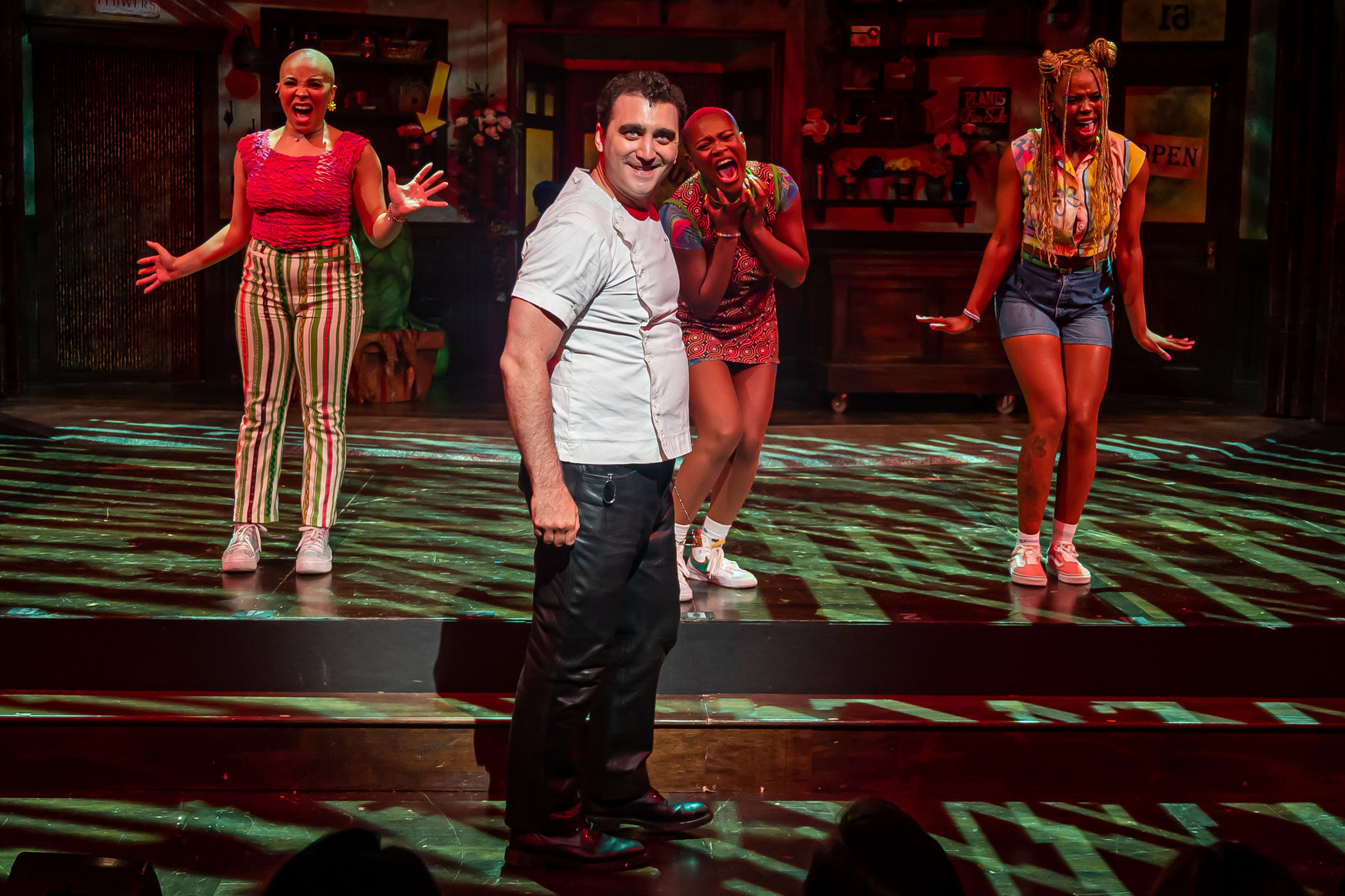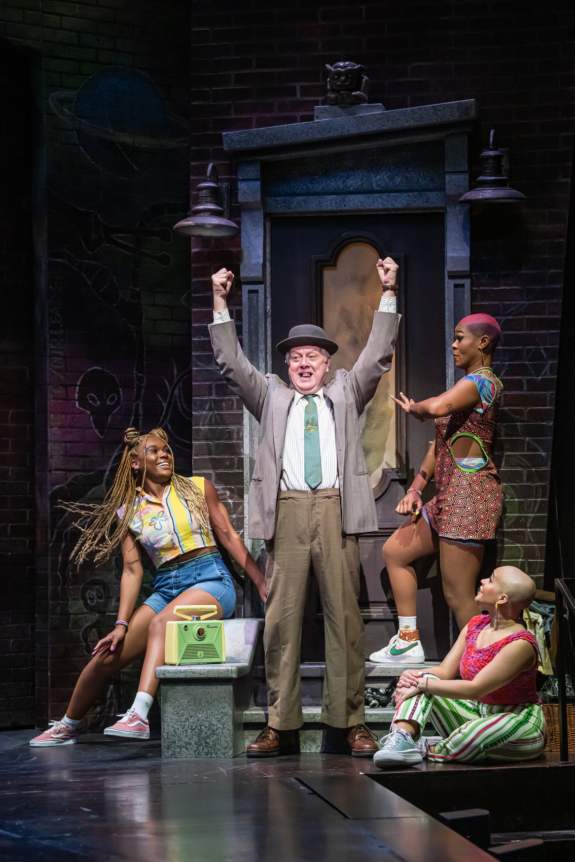 Mr. Mushnik (actor, Aled Davies*) celebrates the success of Audrey II with Crystal (actor, Sydney Alexandra Whittenburg*), Chiffon (actor, Kris Lyons*), and Ronnette (actor, Savannah Cooper*) in the Great Lakes Theater production of LITTLE SHOP OF HORRORS at the Hanna Theatre, Playhouse Square running through October 9. (Photo by Ken Blaze)