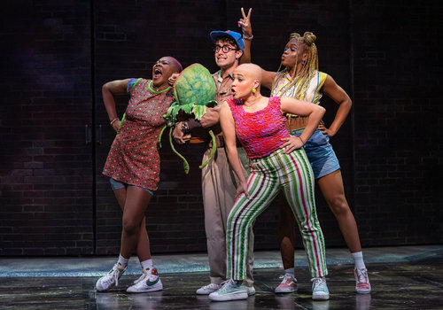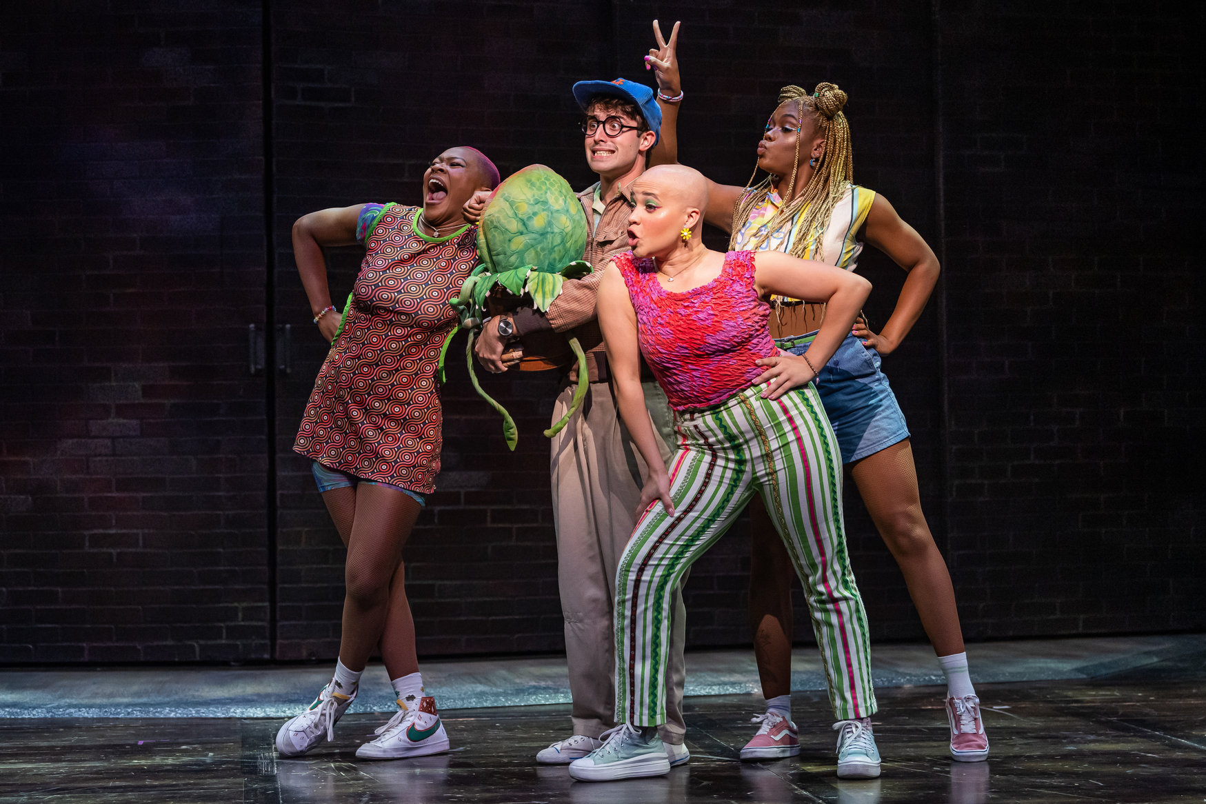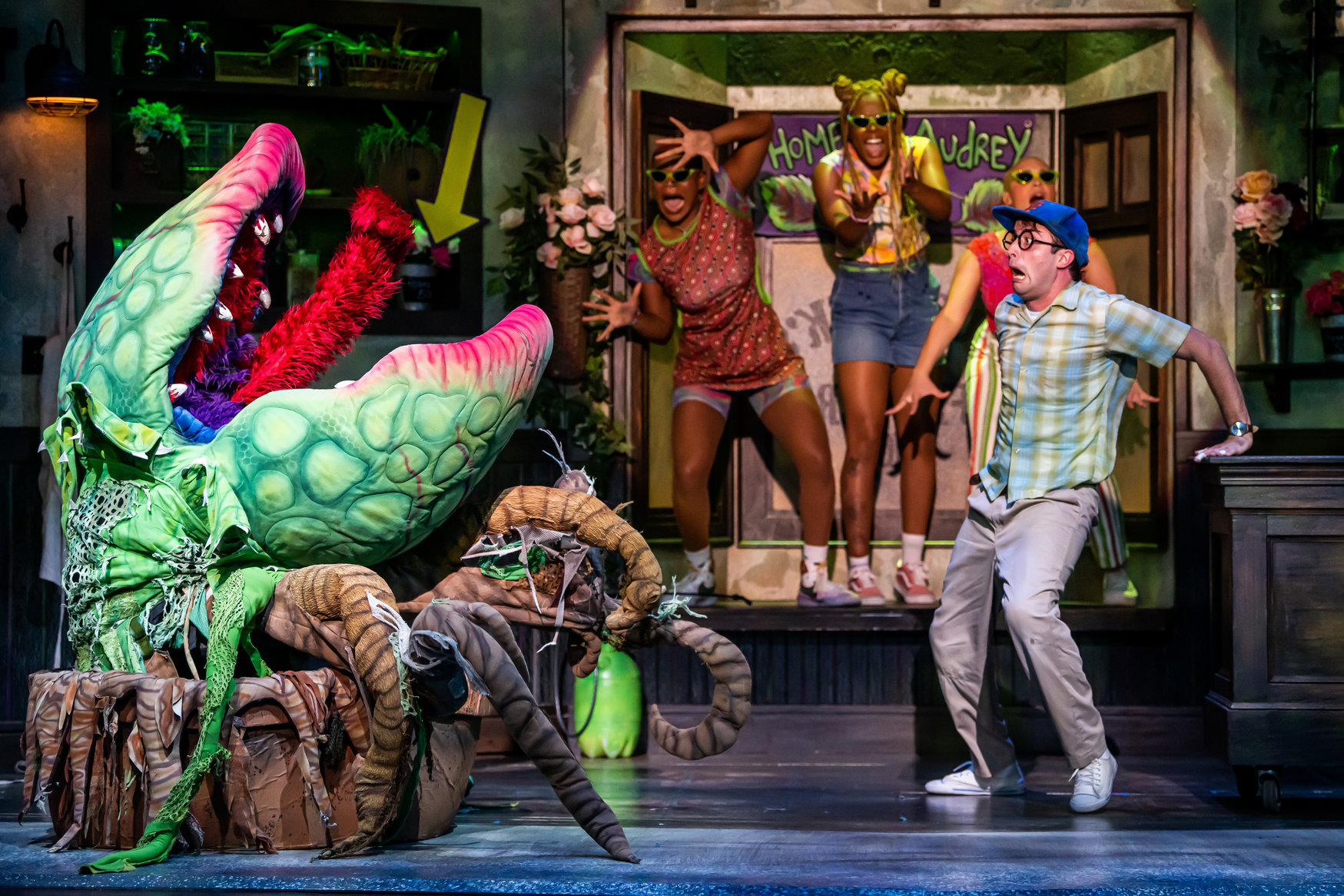 Seymour (actor, Andrew Faria*) poses with Audrey II, Chiffon (actor, Kris Lyons*), Ronnette (actor, Savannah Cooper*), and Crystal (actor, Sydney Alexandra Whittenburg*) as word of his strange and interesting plant starts making the news in the Great Lakes Theater production of LITTLE SHOP OF HORRORS at the Hanna Theatre, Playhouse Square running through October 9. (Photo by Ken Blaze)