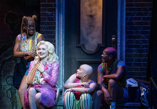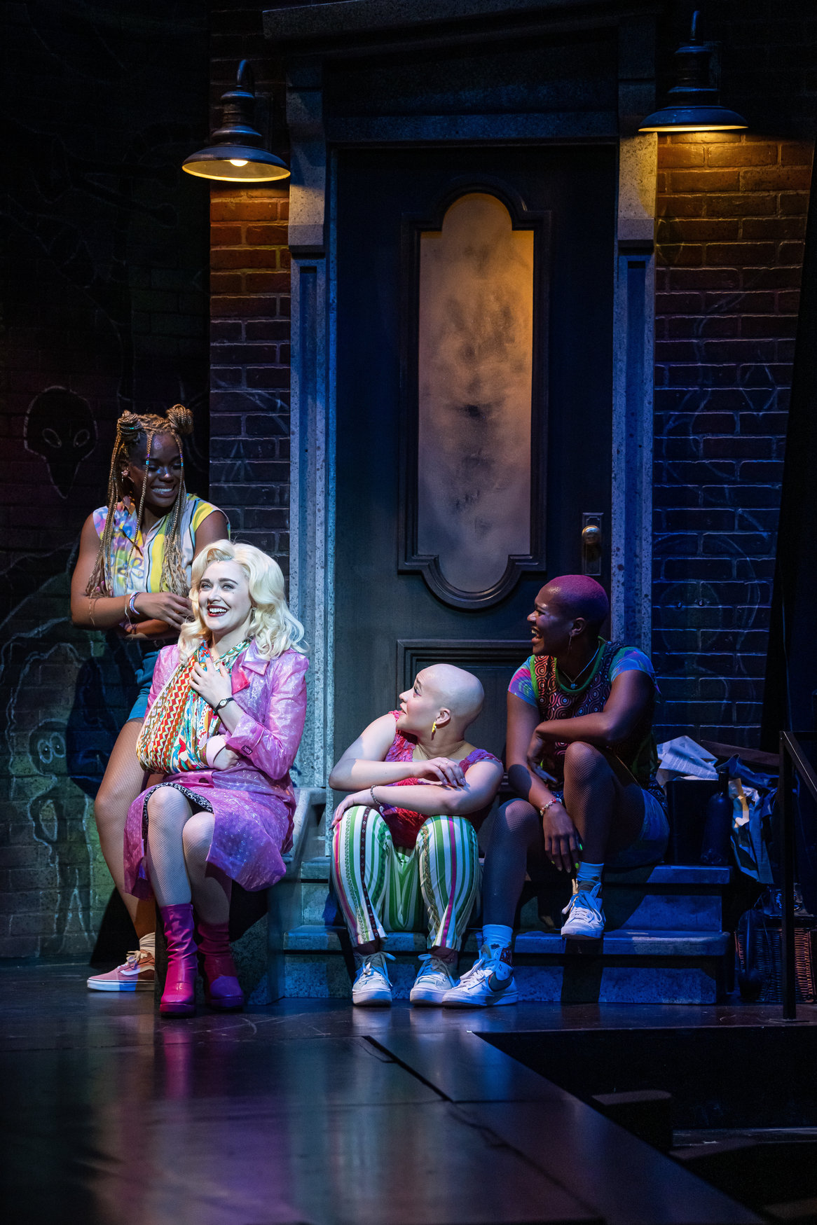 Audrey (actor, Sara Masterson*) shares her dreams with Sydney Alexandra Whittenburg*), Ronnette (actor, Savannah Cooper*), and Chiffon (actor, Kris Lyons*) in the Great Lakes Theater production of LITTLE SHOP OF HORRORS at the Hanna Theatre, Playhouse Square running through October 9. (Photo by Ken Blaze)