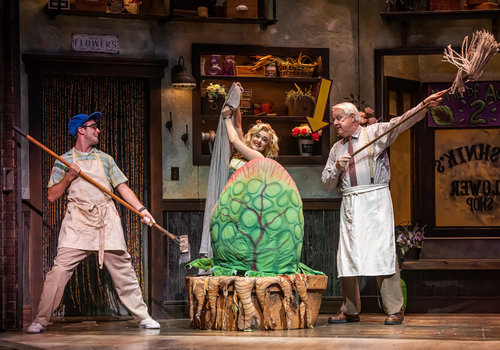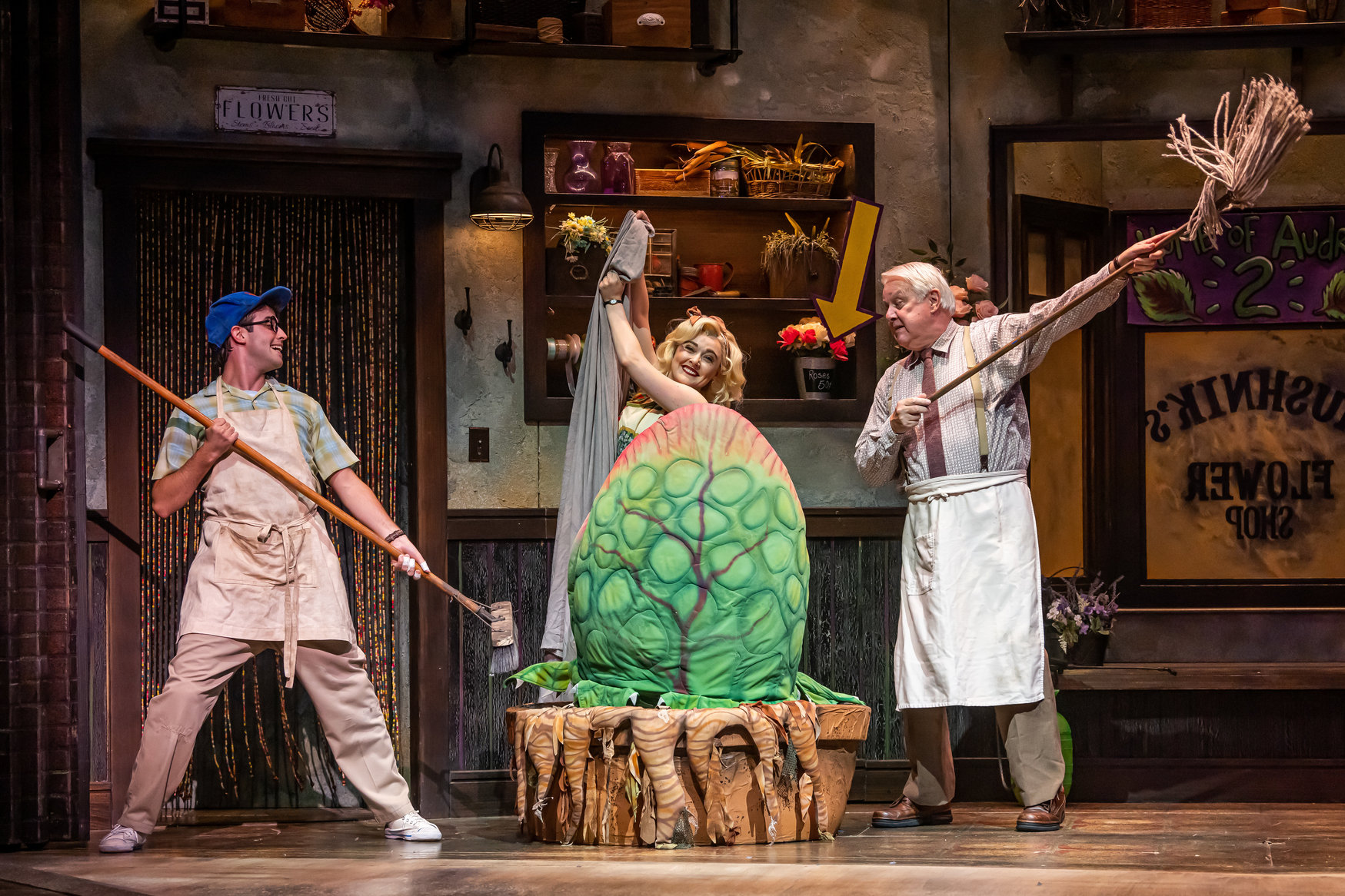 Seymour (actor, Andrew Faria*), Audrey (actor, Sara Masterson*), and Mr. Musnik (actor, Aled Davies*) debut Audrey II after a major renovation of the shop in the Great Lakes Theater production of LITTLE SHOP OF HORRORS at the Hanna Theatre, Playhouse Square running through October 9. (Photo by Ken Blaze)