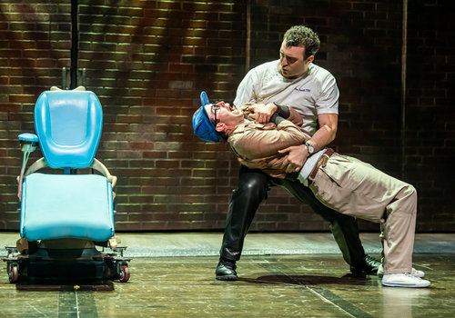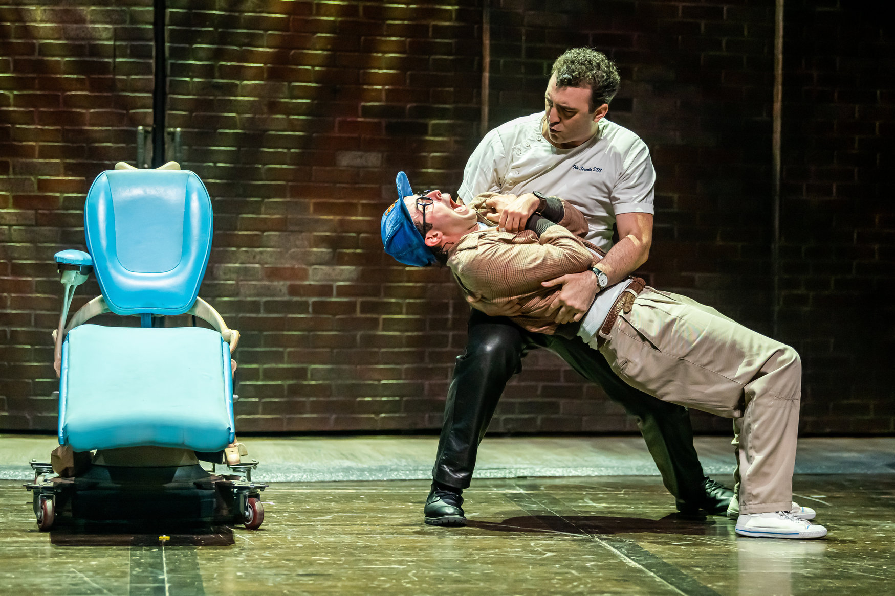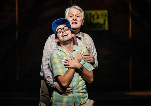 Seymour (actor, Andrew Faria*) and Mr. Mushnik (actor, Aled Davies*) share a tender father-son moment in the Great Lakes Theater production LITTLE SHOP OF HORRORS at the Hanna Theatre, Playhouse Square running through October 9. (Photo by Ken Blaze)