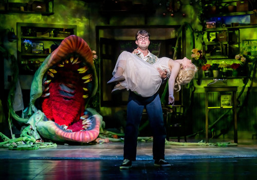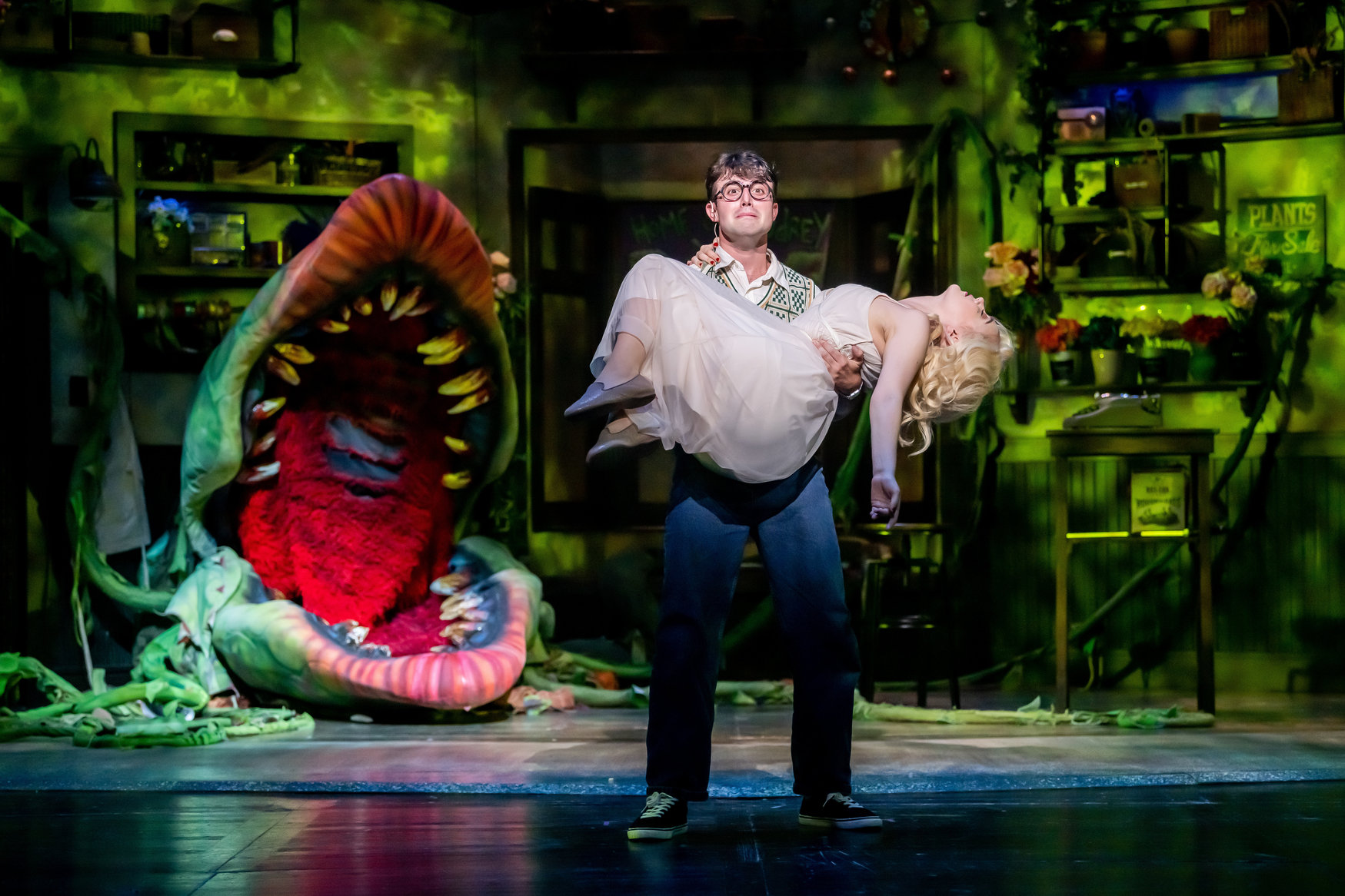 Seymour (actor, Andrew Faria*) carries Audrey (actor, Sara Masterson*) in the Great Lakes Theater production LITTLE SHOP OF HORRORS at the Hanna Theatre, Playhouse Square running through October 9. (Photo by Ken Blaze)