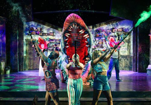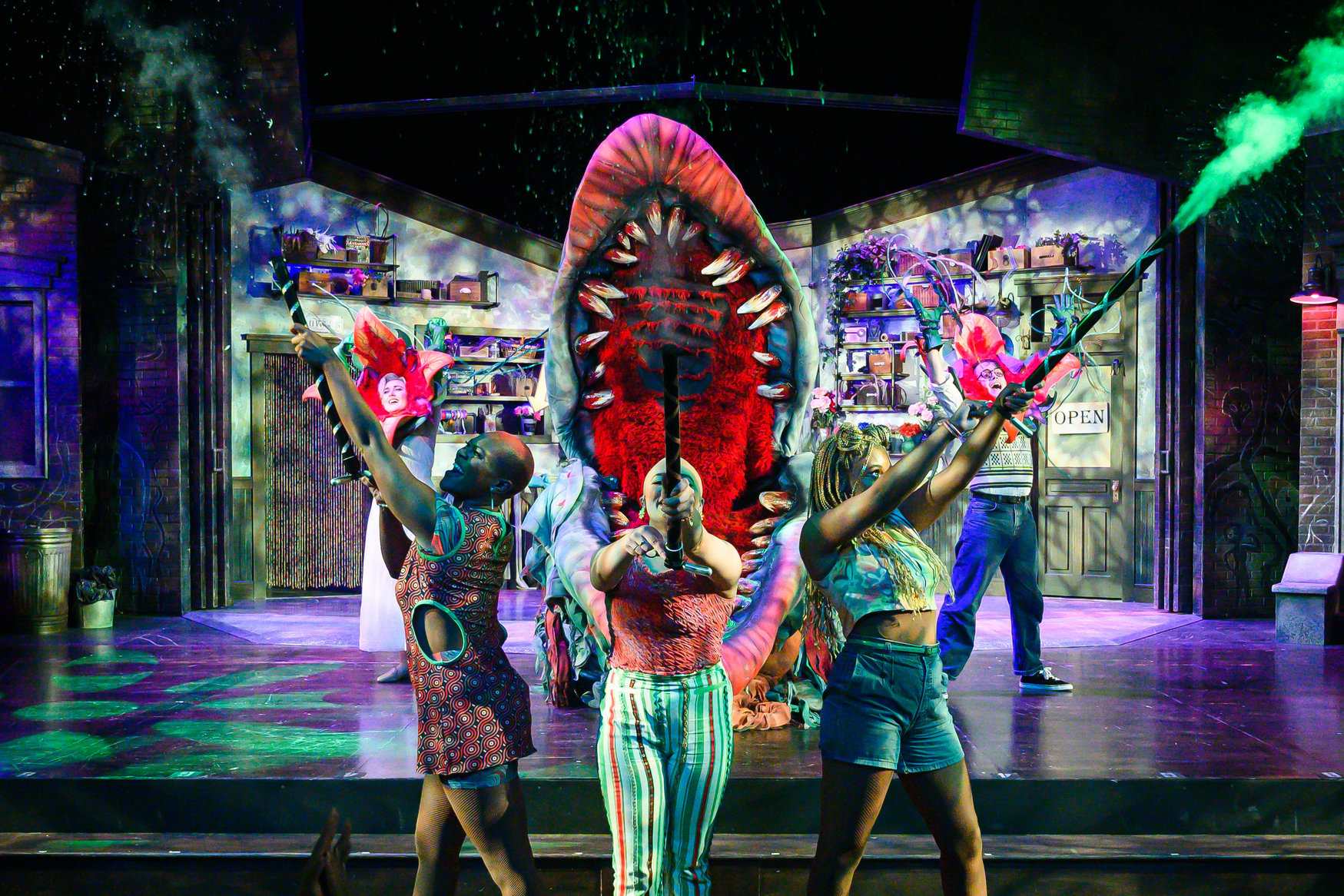 Crystal (actor, Sydney Alexandra Whittenburg* ), Ronnette (actor, Savannah Cooper*), and Chiffon (actor, Kris Lyons*) take center stage in the Great Lakes Theater production LITTLE SHOP OF HORRORS at the Hanna Theatre, Playhouse Square running through October 9. (Photo by Ken Blaze)