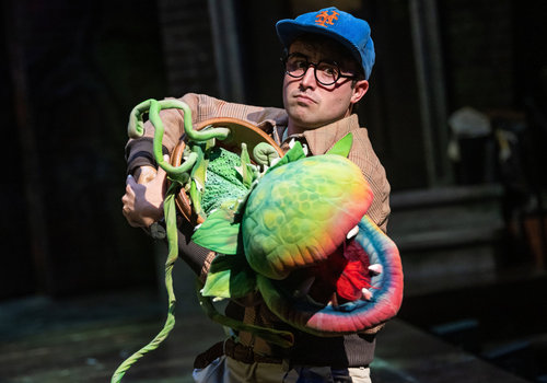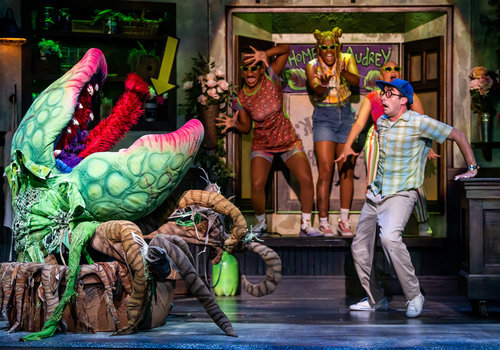Seymour (actor, Andrew Faria*) struggles with a bloodthirsty Audrey II in the Great Lakes Theater production of LITTLE SHOP OF HORRORS at the Hanna Theatre, Playhouse Square running through October 9. (Photo by Ken Blaze)