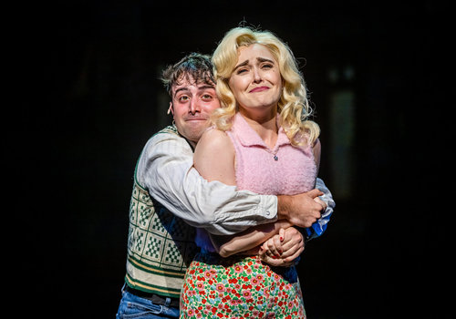 Seymour (actor, Andrew Faria*) and Audrey (actor, Sara Masterson*) share a tender moment in the Great Lakes Theater production of LITTLE SHOP OF HORRORS at the Hanna Theatre, Playhouse Square running through October 9. (Photo by Ken Blaze)