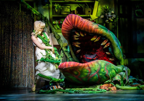 Audrey (actor Sara Masterson*) and Audrey II have an encounter in the Great Lakes Theater production of LITTLE SHOP OF HORRORS at the Hanna Theatre, Playhouse Square running through October 9. (Photo by Ken Blaze)
