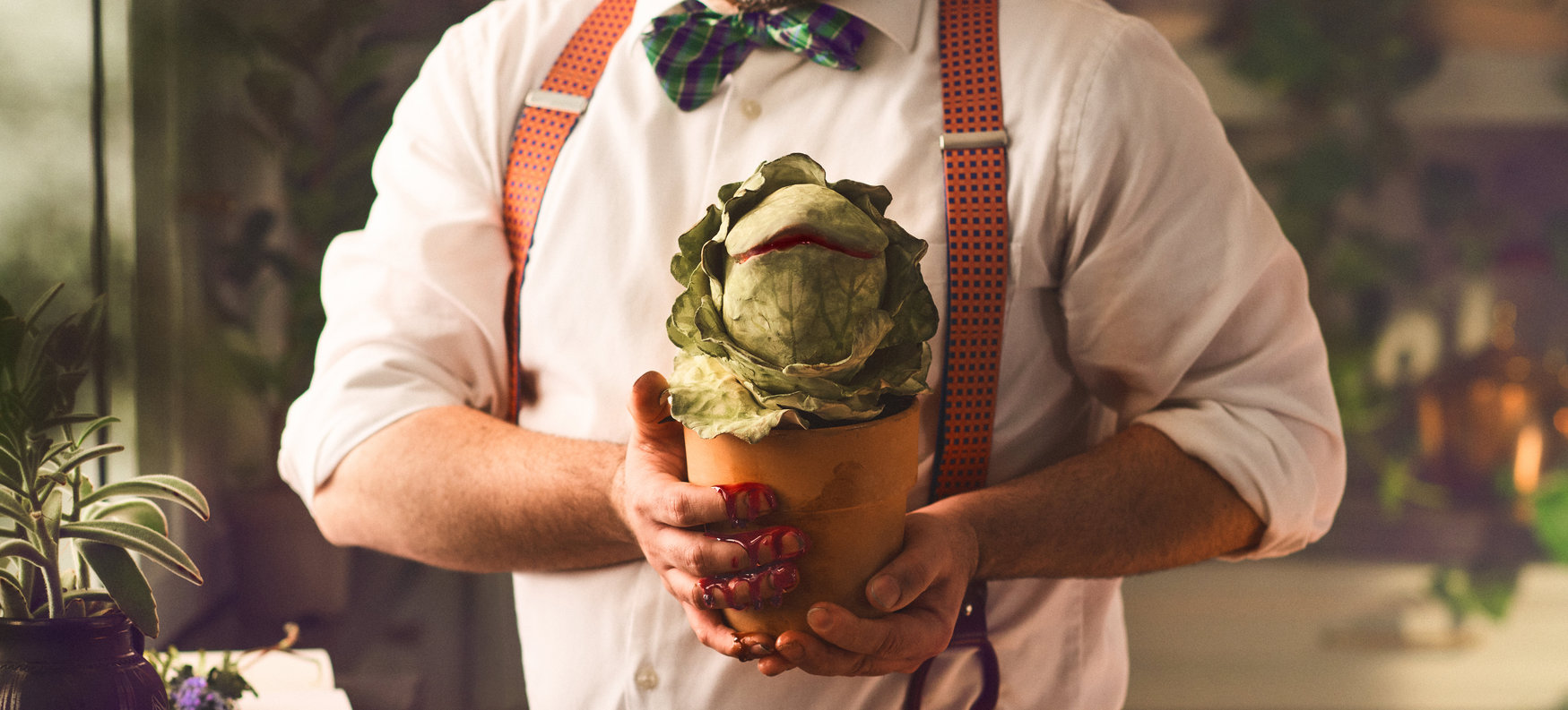 Seymour (actor, Andrew Faria*) pleads with Audrey II in the Great Lakes Theater production of LITTLE SHOP OF HORRORS at the Hanna Theatre, Playhouse Square running through October 9. (Photo by Ken Blaze