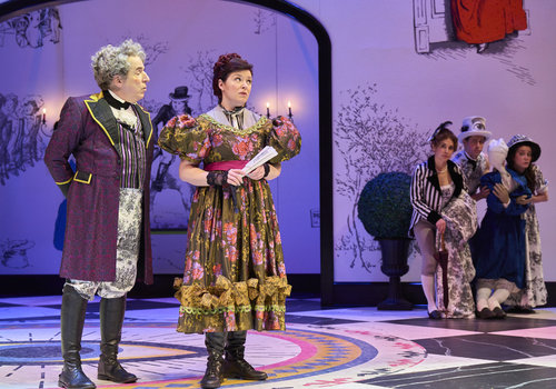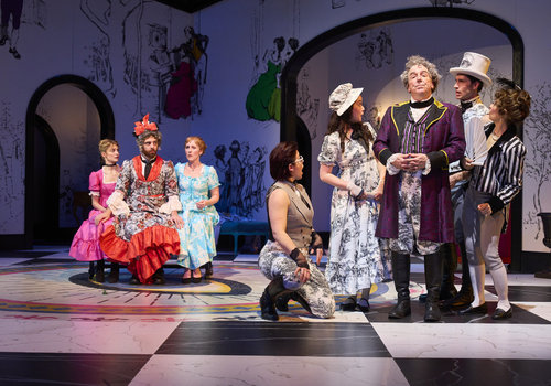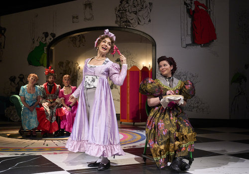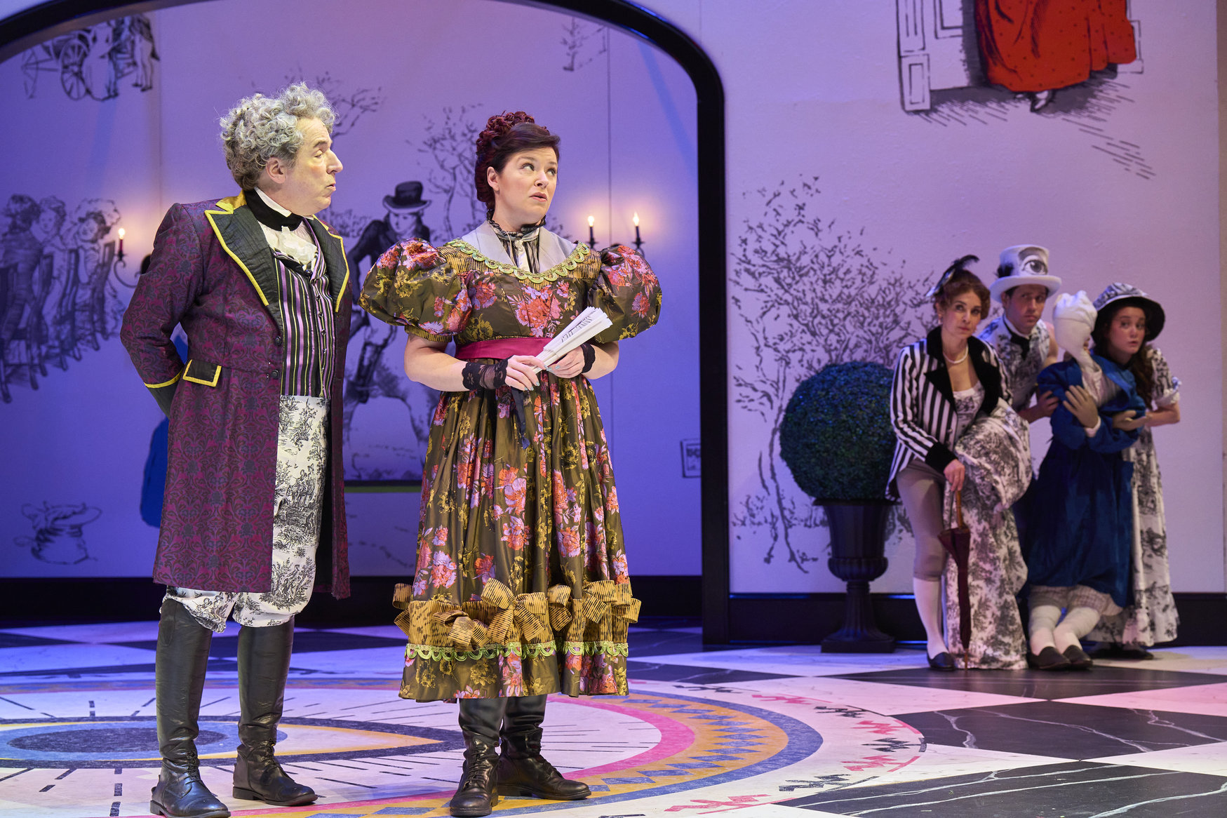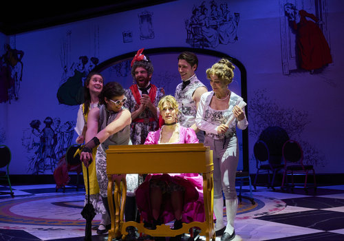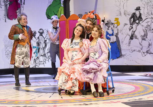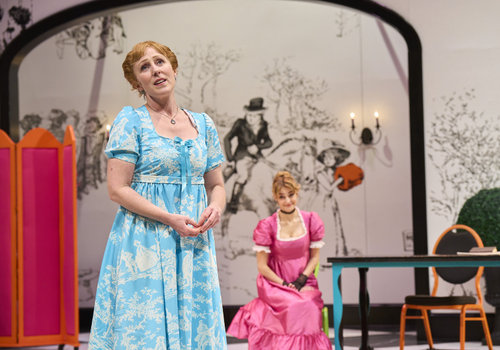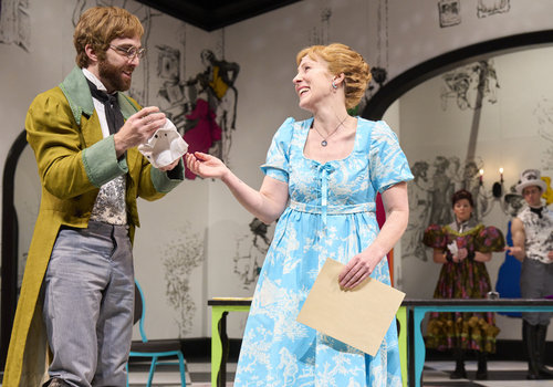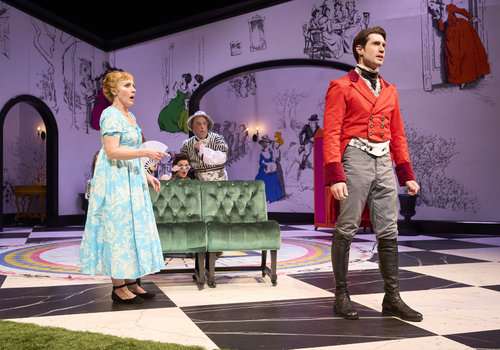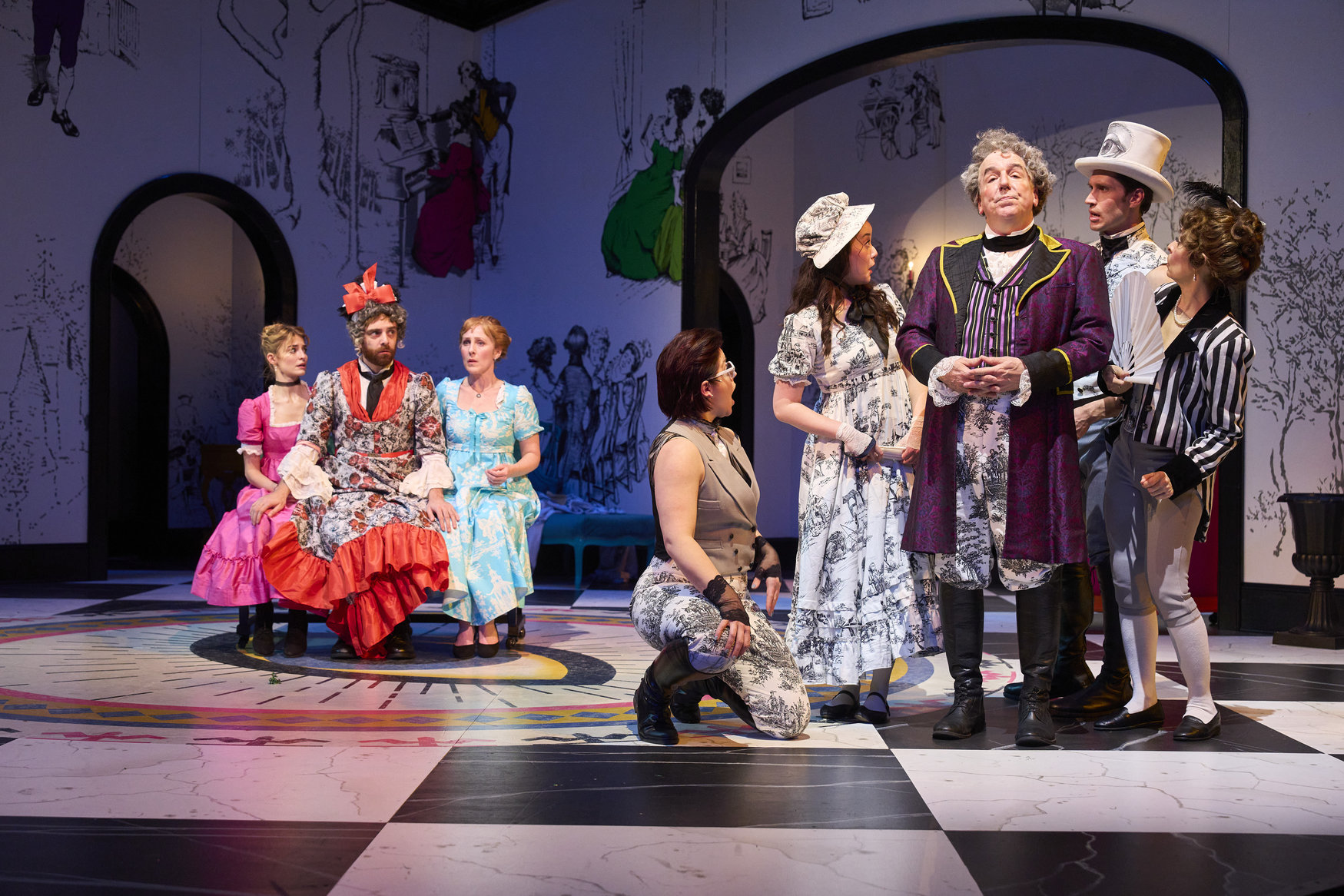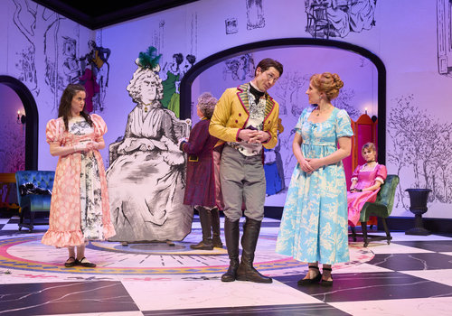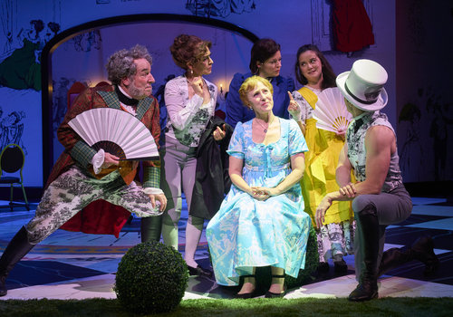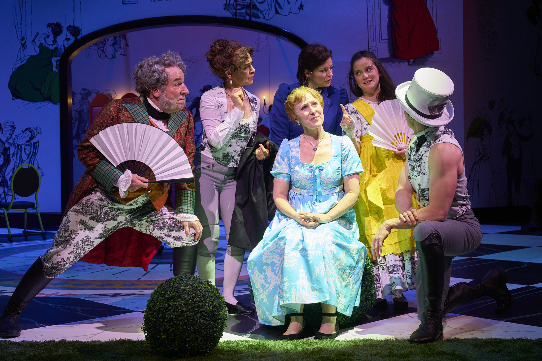 Mrs. Jennings (actor, Joe Wegner*) welcomes Lucy Steele (actor, Hanako Walrath*) and Anne Steele (actor, Vilma Silva*) in the Great Lakes Theater production of SENSE AND SENSIBILITY at the Hanna Theatre, Playhouse Square, which runs through March 5. Other actors featured l to r: M.A. Taylor* and Nick Steen*. (Photo by Roger Mastroianni)