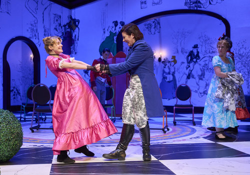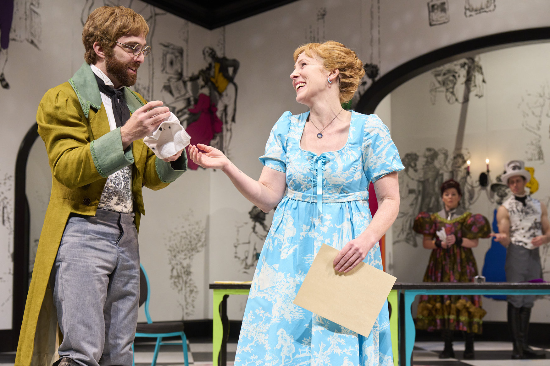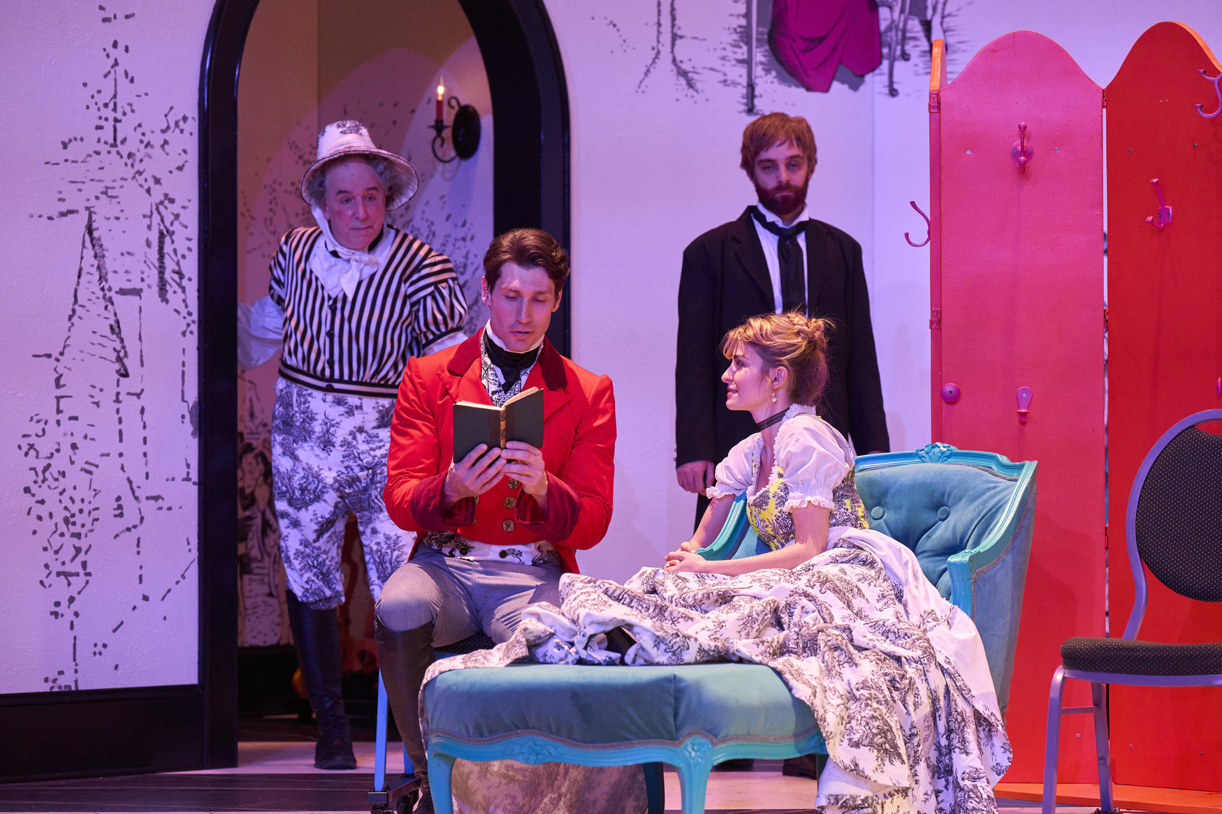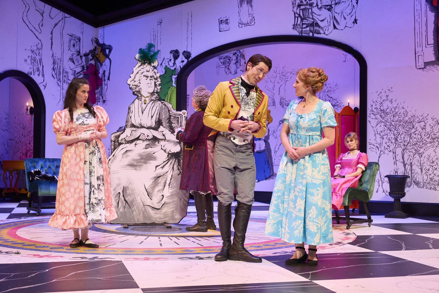 Marianne (actor, Ángela Utrera*) is smitten with Mr. Willoughby (actor, Laura Welsh Berg*) as Elinor (actor, Maggie Kettering*) and Colonel Brandon (actor, Nick Steen*) watch disapprovingly in the Great Lakes Theater production SENSE AND SENSIBILITY at the Hanna Theatre, Playhouse Square, which runs through March 5. (Photo by Roger Mastroianni)