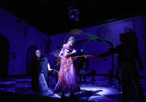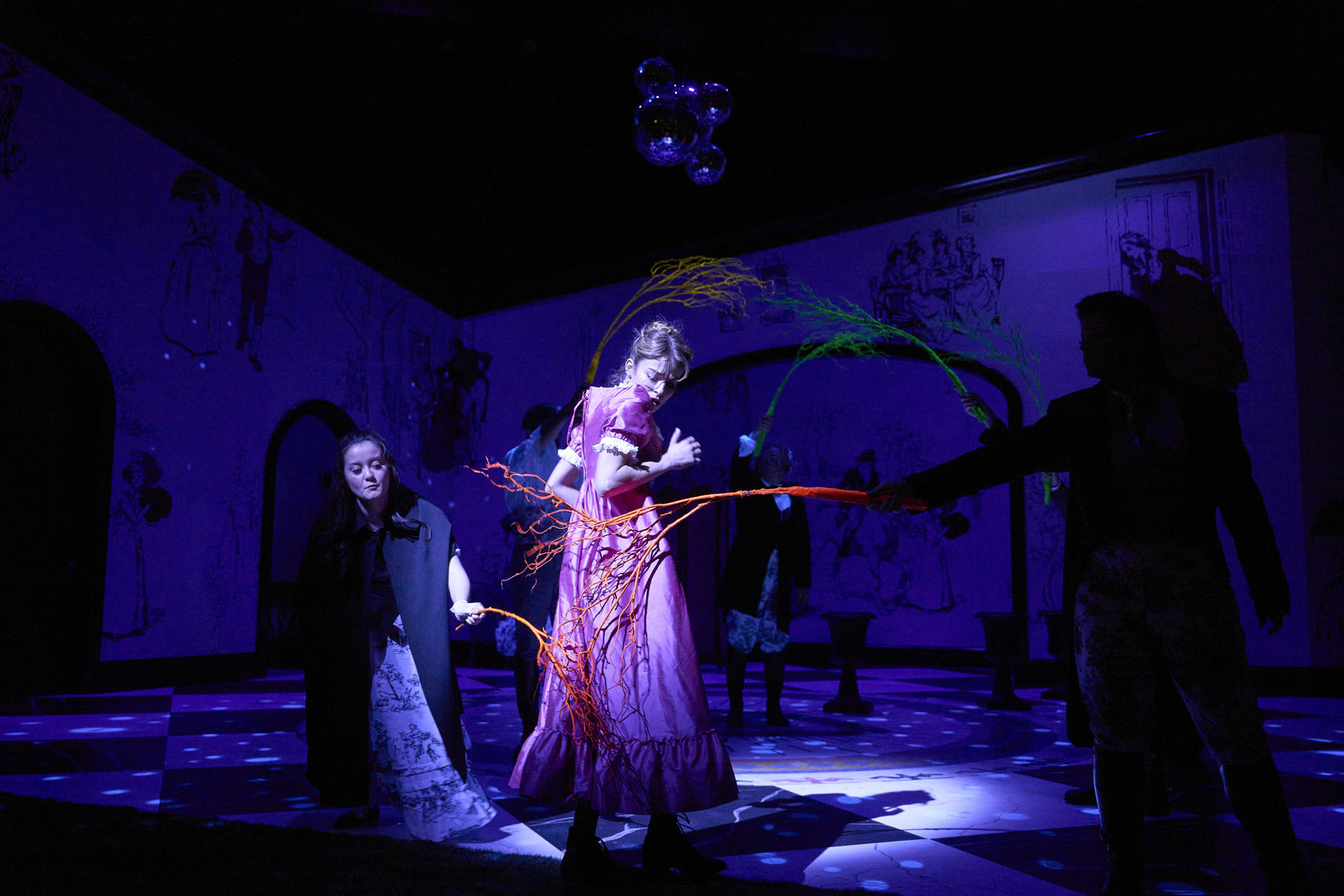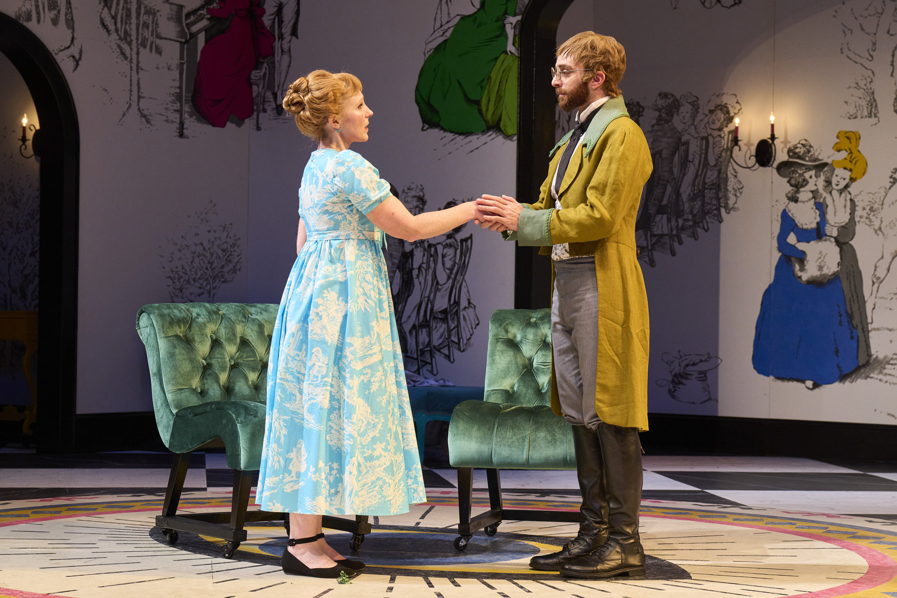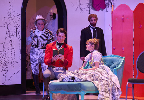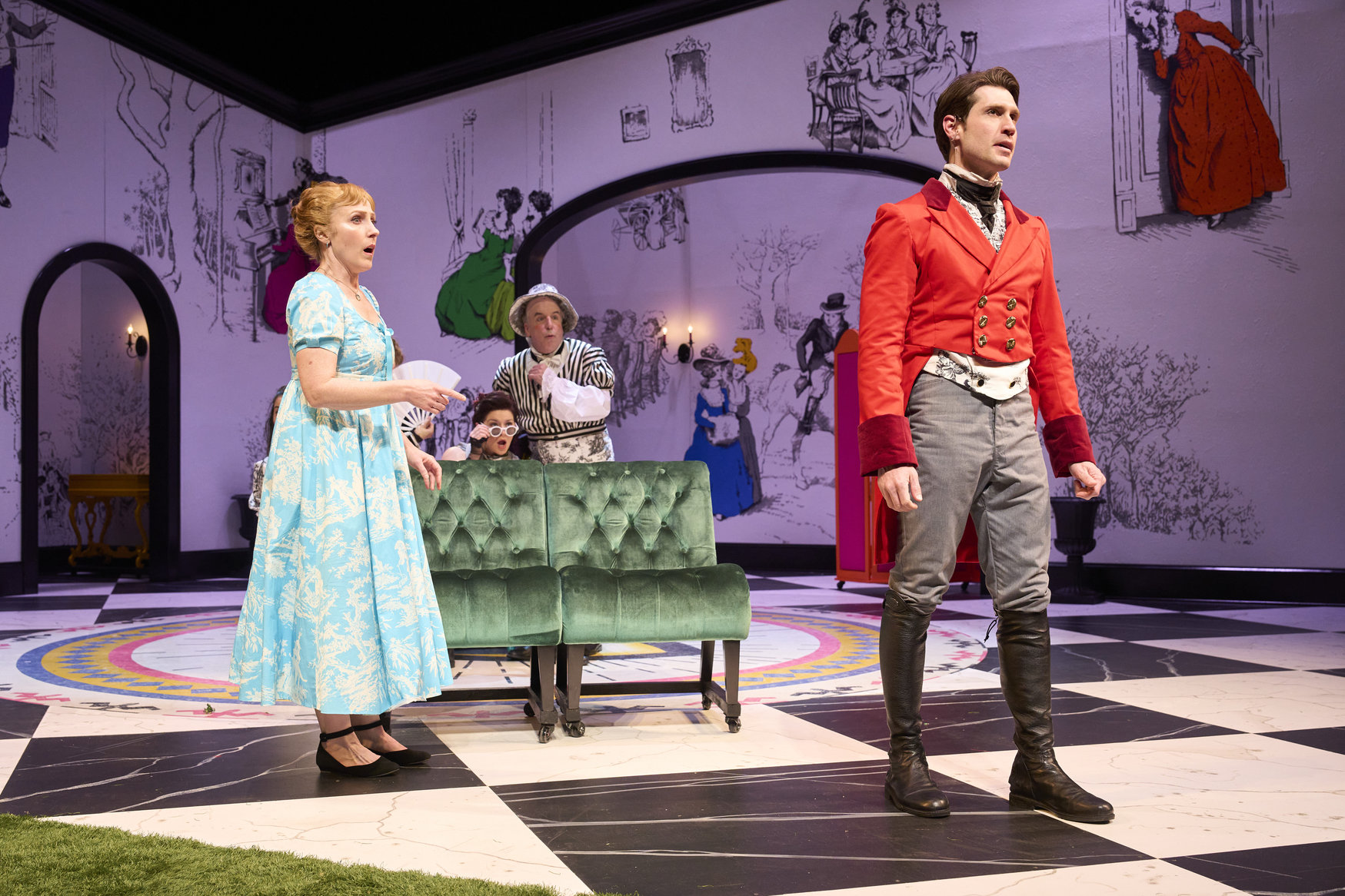 Marianne (actor, Ángela Utrera*) is smitten with Mr. Willoughby (actor, Laura Welsh Berg*) as Elinor (actor, Maggie Kettering*) and Colonel Brandon (actor, Nick Steen*) watch disapprovingly in the Great Lakes Theater production SENSE AND SENSIBILITY at the Hanna Theatre, Playhouse Square, which runs through March 5. (Photo by Roger Mastroianni)