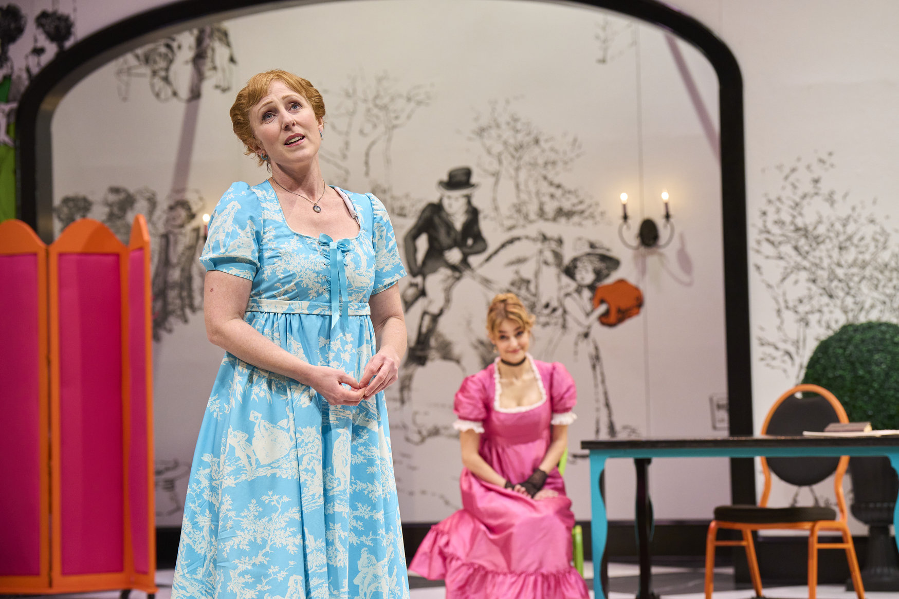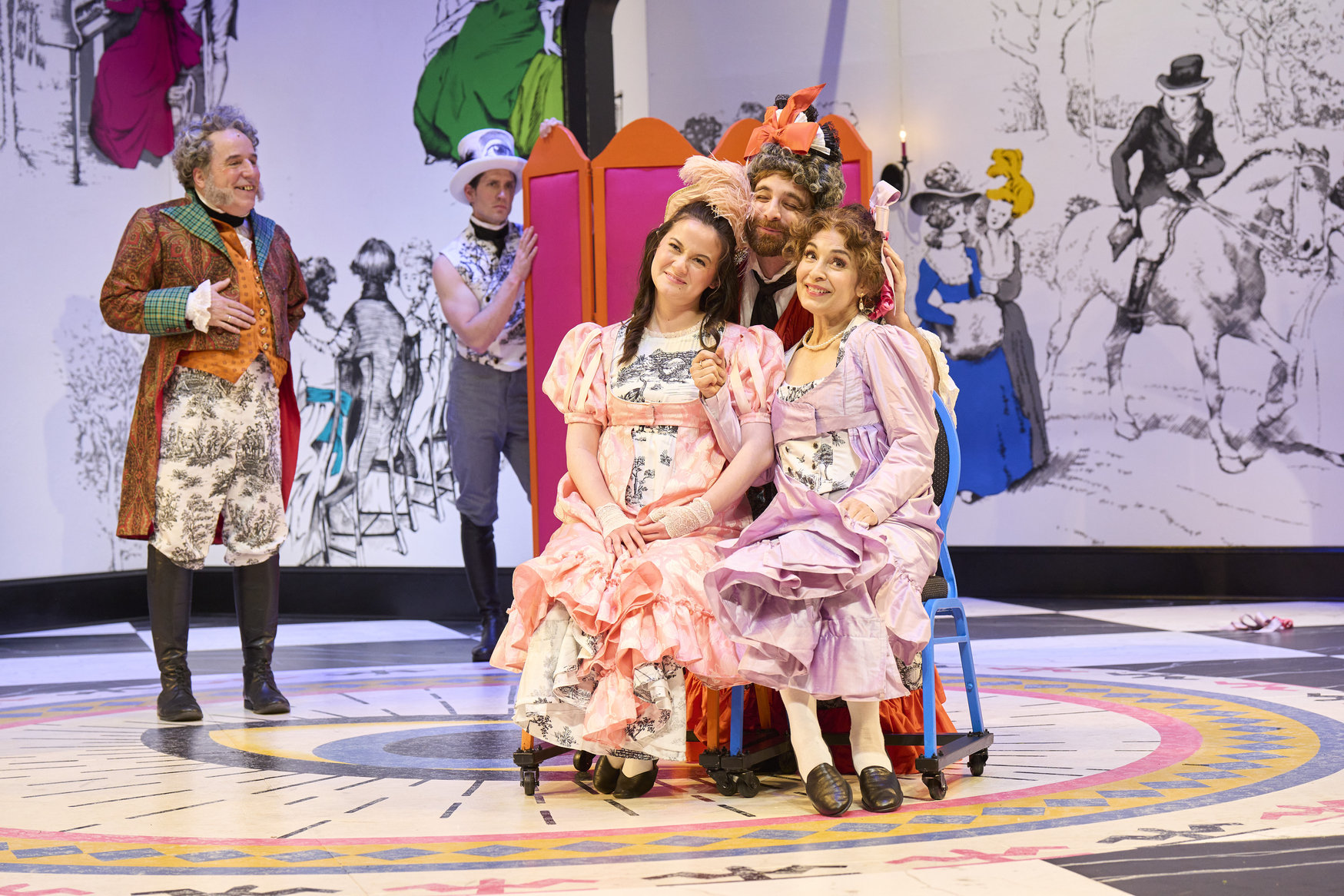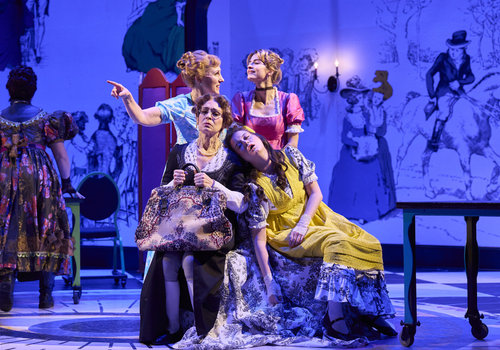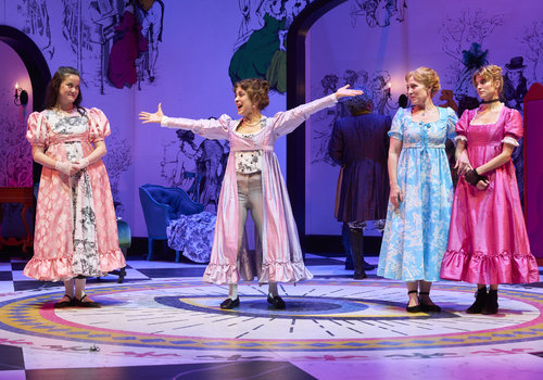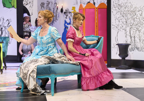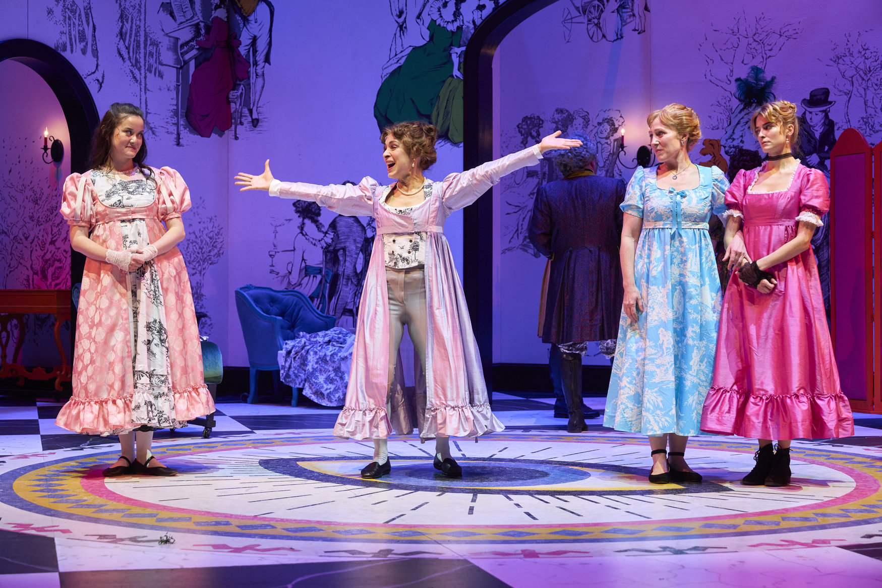 Anne Steele (actor, Vilma Silva*) shares her love of pink ribbons with Fanny (actor, Laura Welsh Berg*) as Elinor (actor, Maggie Kettering*), Mrs. Jennings (actor, Joe Wegner*) and Marianne (actor, Ángela Utrera*) observe the interaction in the Great Lakes Theater production SENSE AND SENSIBILITY at the Hanna Theatre, Playhouse Square, which runs through March 5. Photo by Roger Mastroianni)