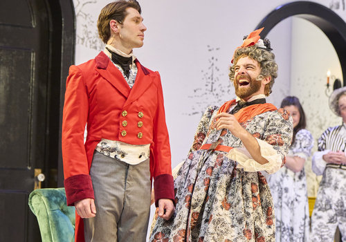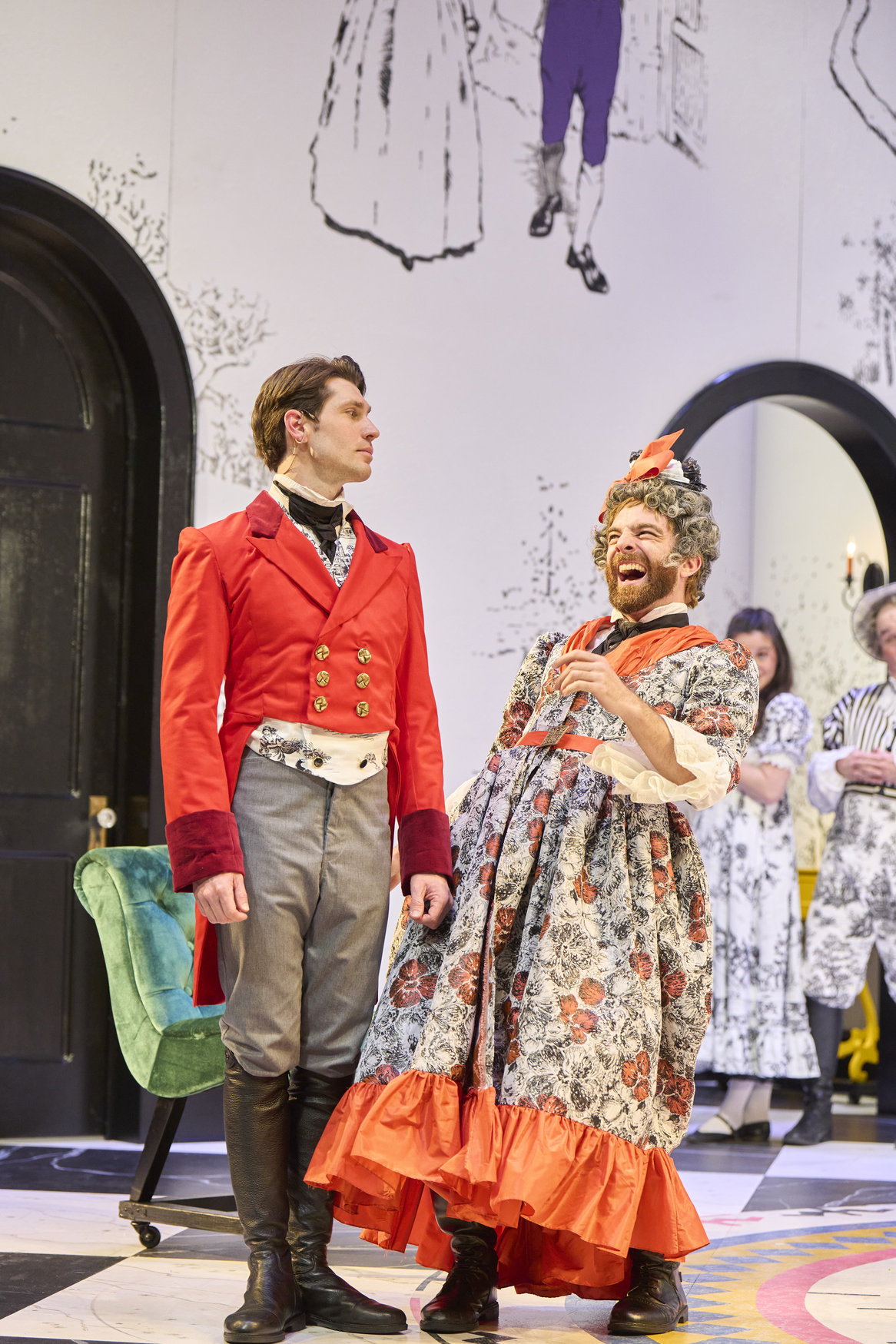 Mrs. Jennings (actor, Joe Wegner*) shares a laugh with Colonel Brandon (actor, Nick Steen*) in the Great Lakes Theater production of SENSE AND SENSIBILITY at the Hanna Theatre, Playhouse Square, which runs through March 5. (Photo by Roger Mastroianni)