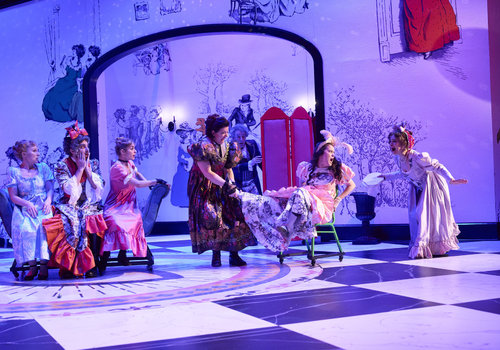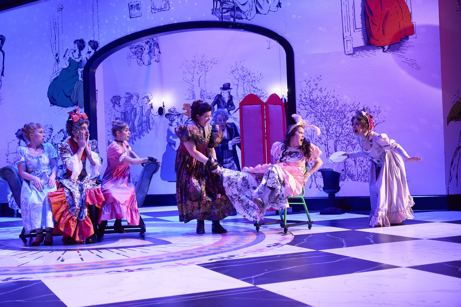 Fanny (actor, Laura Welsh Berg*) reacts poorly against Lucy Steele (actor, Hanako Walrath*) as Elinor (actor, Maggie Kettering*), Mrs. Jennings (actor, Joe Wegner*), Marianne (actor, Ángela Utrera*) and Anne (actor, Vilma Silva*) look on in disbelieve in the Great Lakes Theater production SENSE AND SENSIBILITY at the Hanna Theatre, Playhouse Square, which runs through March 5. (Photo by Roger Mastroianni)