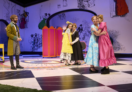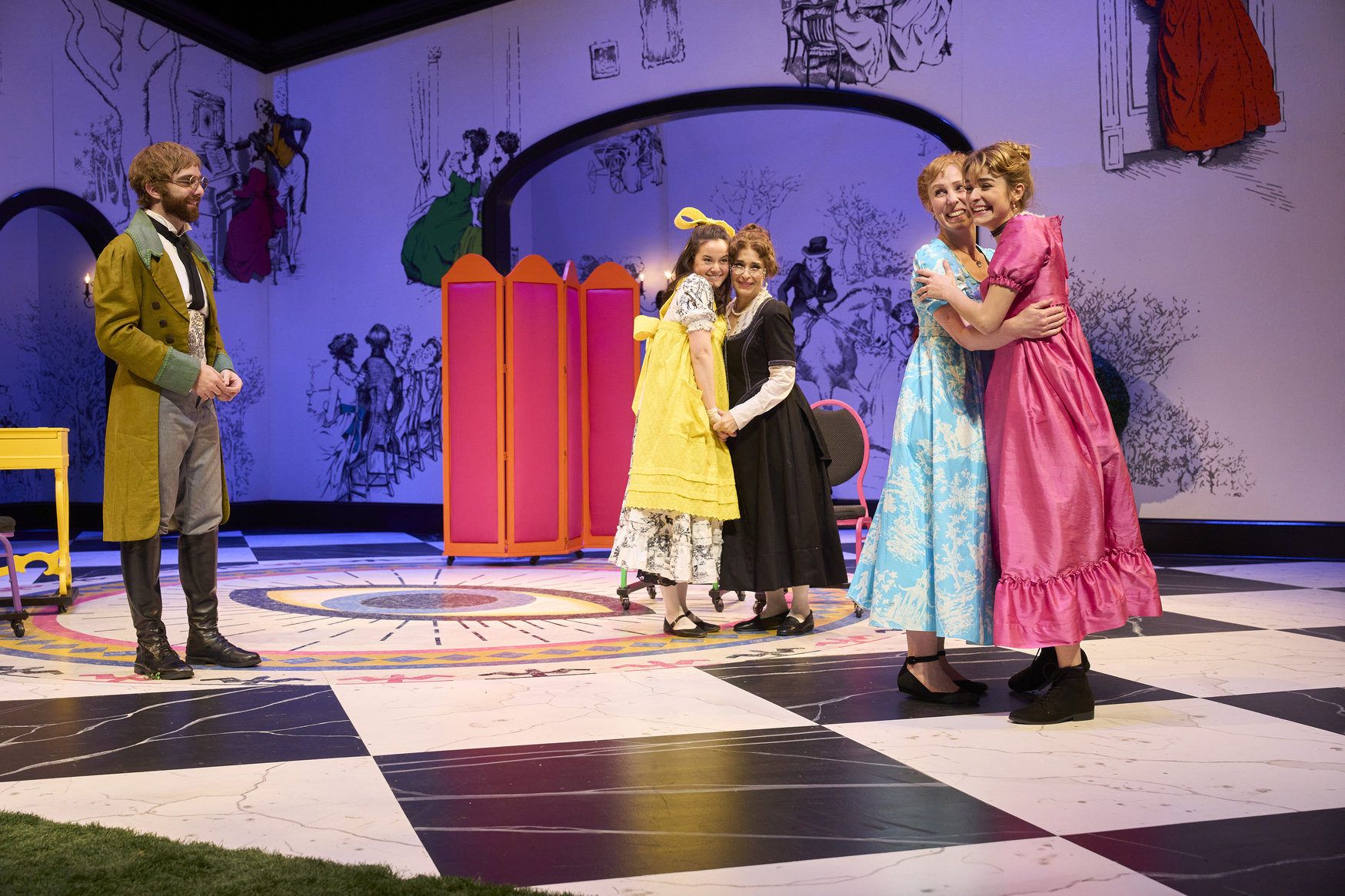 The Dashwoods (actors from l to r, Hanako Walrath*, Vilma Silva*, Maggie Kettering* and Ángela Utrera*) and Edward Ferrars (actor, Joe Wegner) delight in their newfound happiness in the Great Lakes Theater production SENSE AND SENSIBILITY at the Hanna Theatre, Playhouse Square, which runs through March 5. (Photo by Roger Mastroianni)