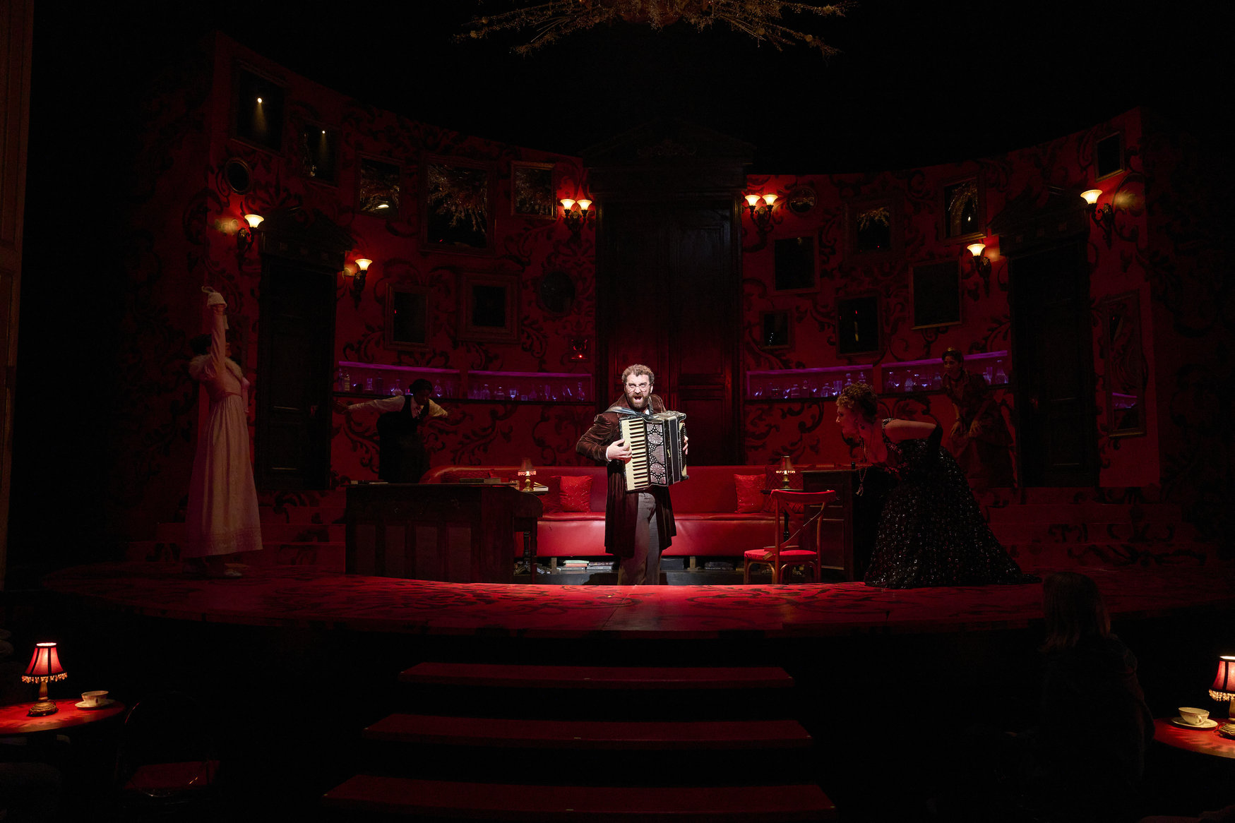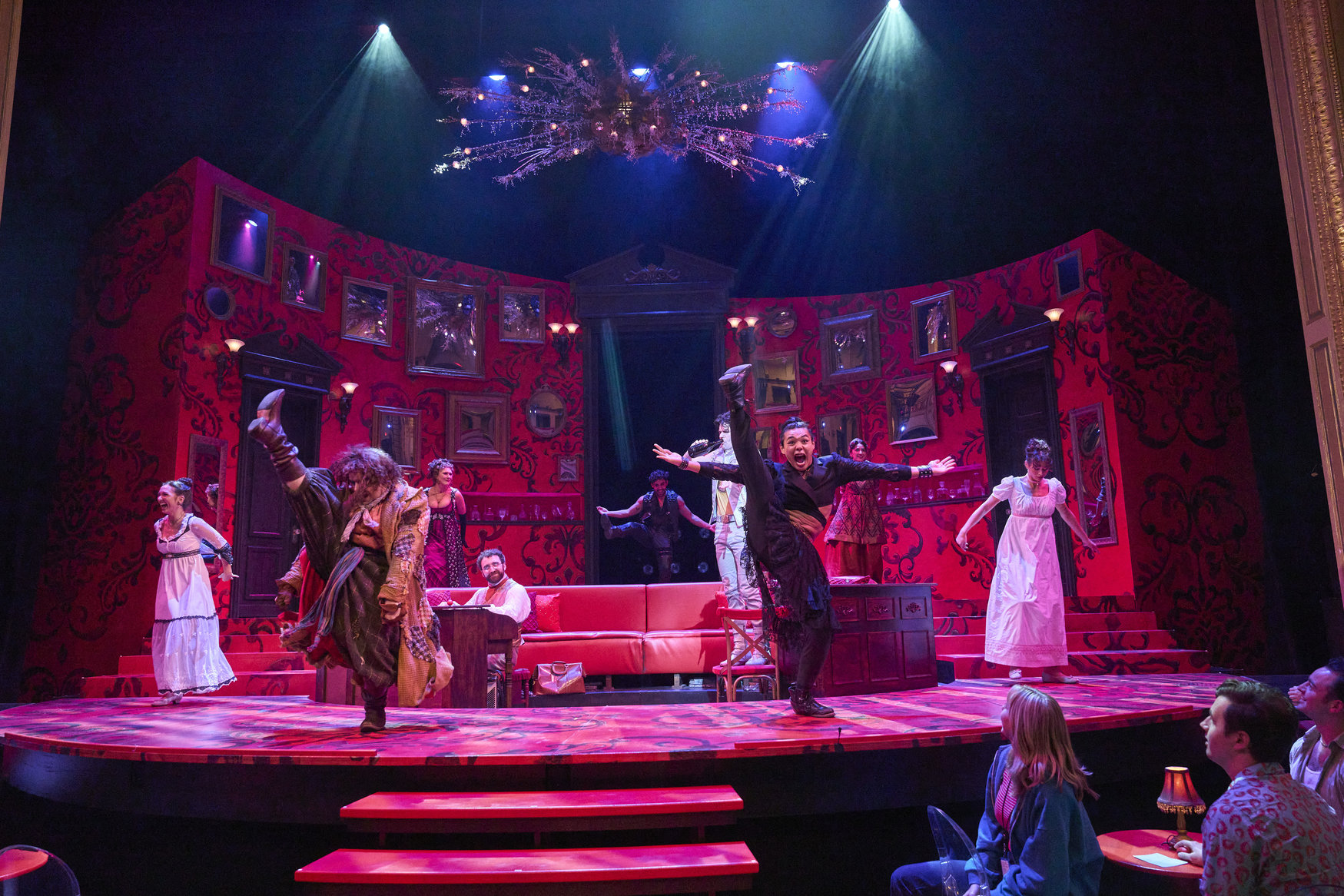 "Balaga (actor, Bóe Wank*) is here!" shop in the Great Lakes Theater production of NATASHA, PIERRE & THE GREAT COMET OF 1812 at the Hanna Theatre, Playhouse Square running through October 8. Other actors featured from l to r: Praise Oranika, Alexa Lopez*, Ángela Utrera*, Benjamin Michael Hall, Alex Syiek*, Dario Alvarez*, Chris McCarrell*, Jillian Kates*, Camille Brooks*, Danny Bó*, Jaedynn Latter, Cole Burden* and Bella Serrano.* (Photo by Roger Mastroianni)