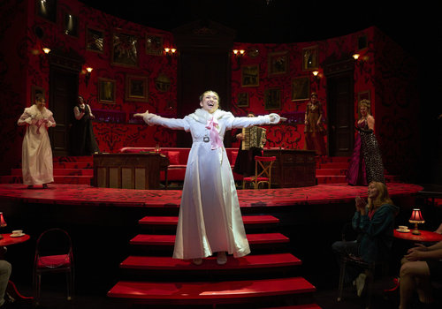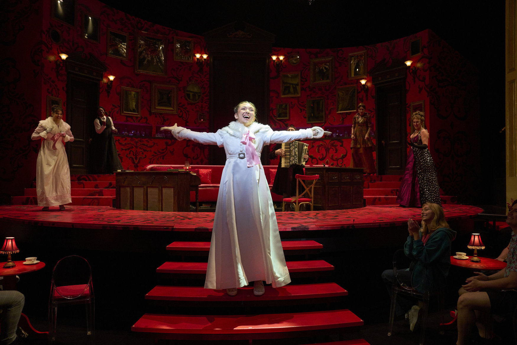 Natasha (actor, Jessi Kirtley*) "is young" in the Great Lakes Theater production of NATASHA, PIERRE & THE GREAT COMET OF 1812 at the Hanna Theatre, Playhouse Square, running through October 8. Other actors featured from l to r: Alexa Lopez*, Camille Brooks*, Alex Syiek*, Jodi Dominick* and Jillian Kates*. (Photo by Roger Mastroianni)
