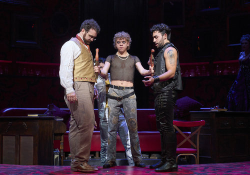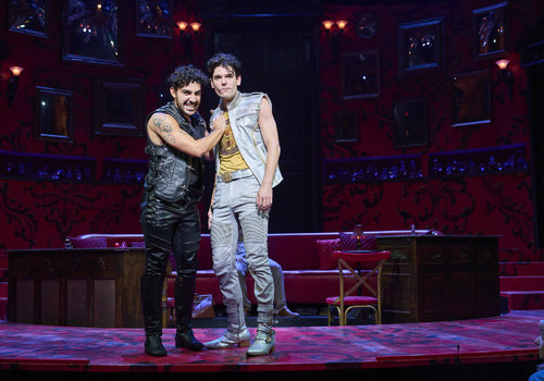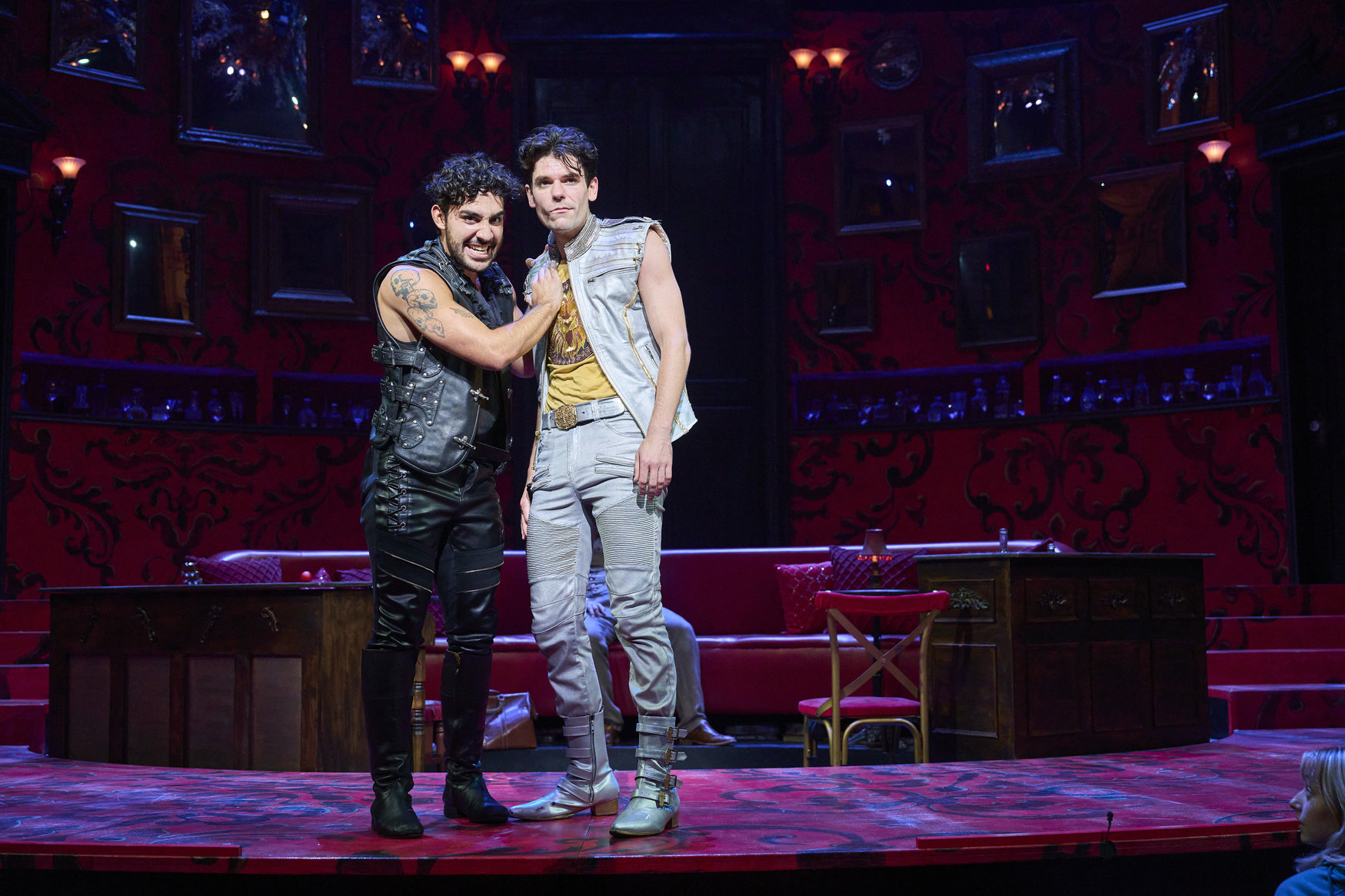 Dolokhov (actor, Dario Alvarez*) and Anatole (actor, Chris McCarrell*) make preparations to steal Natasha away in the Great Lakes Theater production of NATASHA, PIERRE & THE GREAT COMET OF 1812 at the Hanna Theatre, Playhouse Square running through October 8. (Photo by Roger Mastroianni)