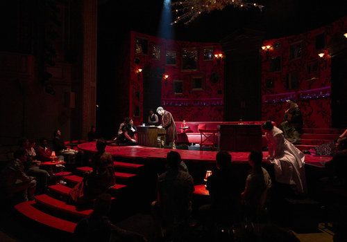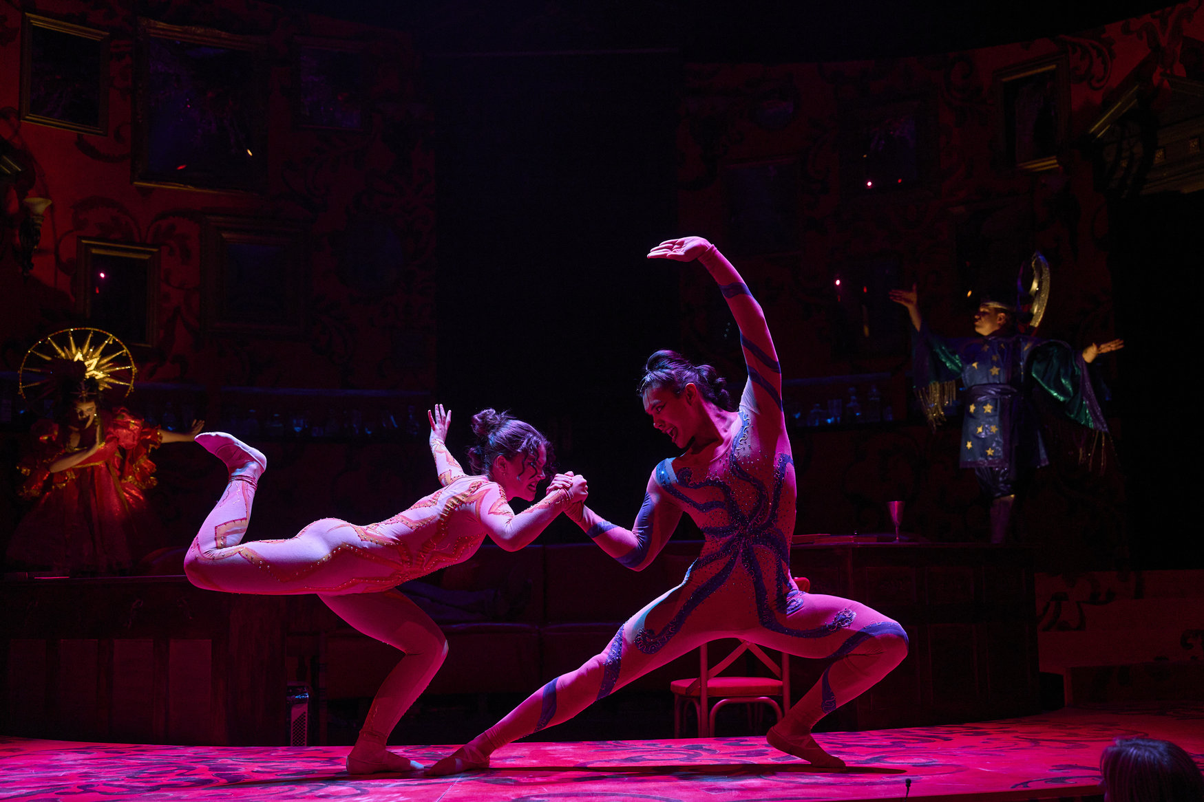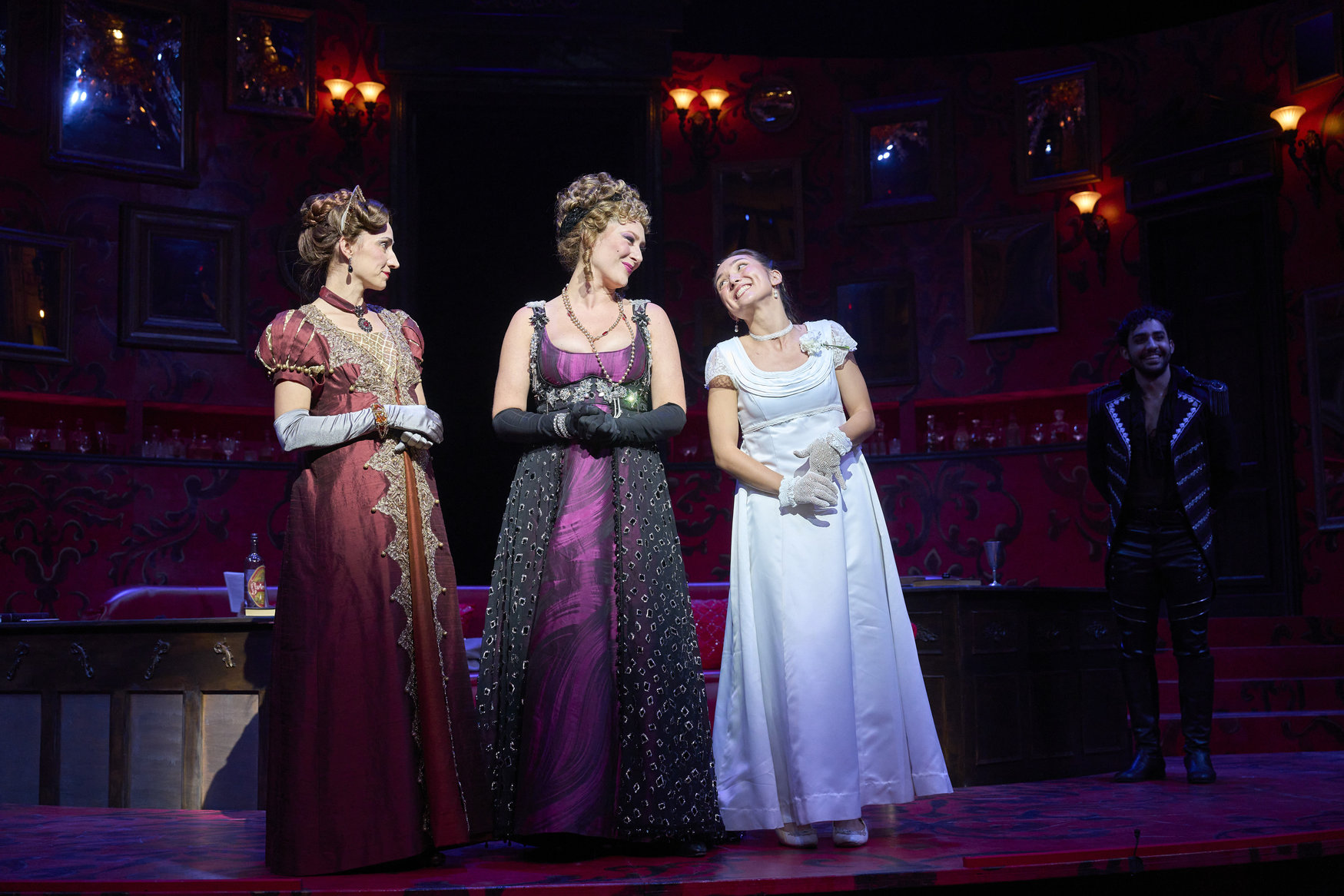 Natasha (actor, Jessi Kirtley*) meets Hélène (actor, Jillian Kates*) for the first time as Marya D. (actor, Jodi Dominick*) and Dolokhov (actor, Dario Alvarez*) observe in the Great Lakes Theater production of NATASHA, PIERRE & THE GREAT COMET OF 1812 at the Hanna Theatre, Playhouse Square running through October 8. (Photo by Roger Mastroianni)