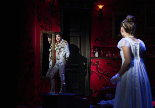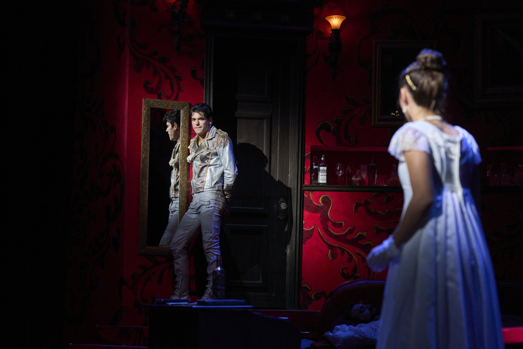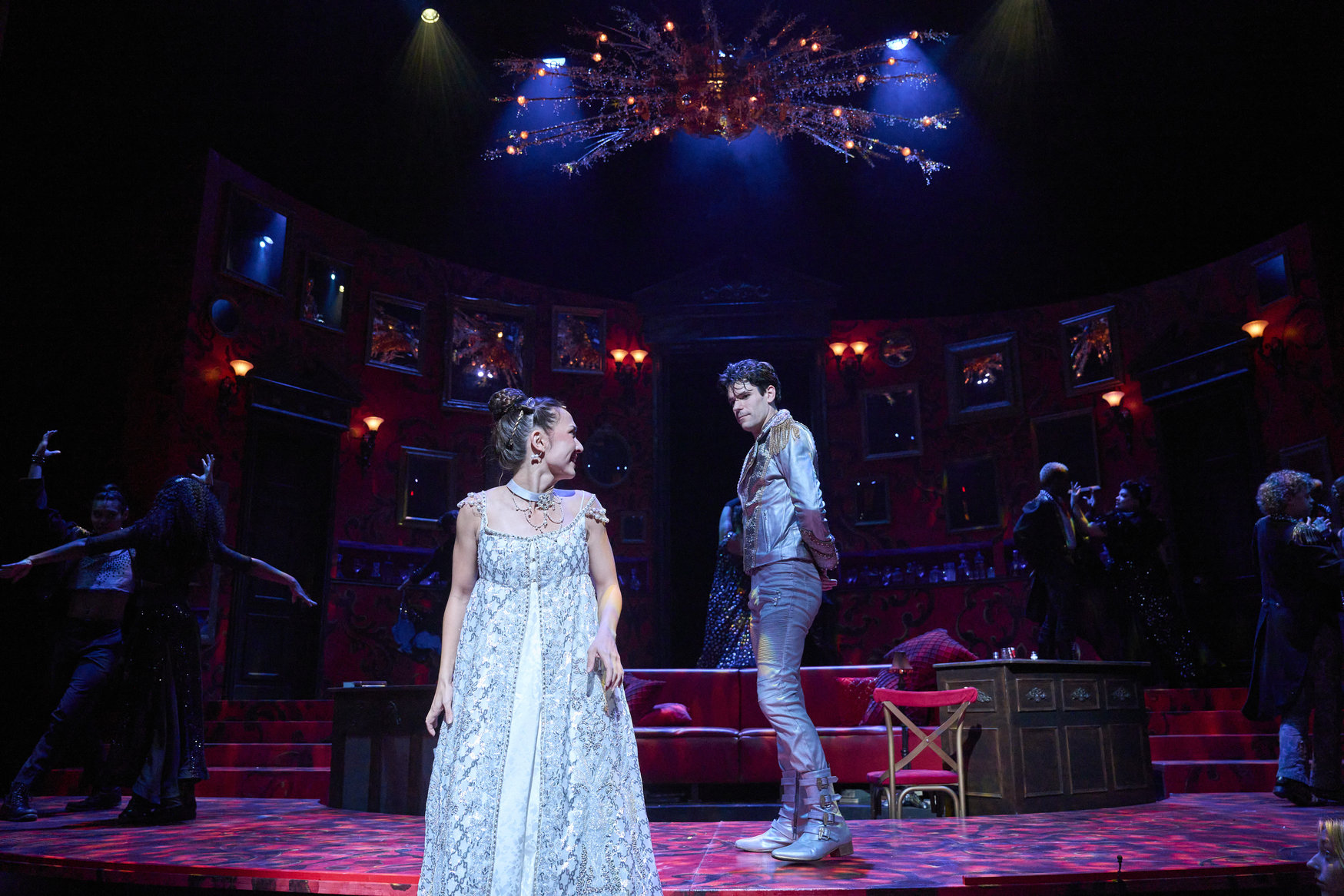Anatole (actor, Chris McCarrell*) fixes his sights on the engaged Natasha (actor, Jessi Kirtley*) in the Great Lakes Theater production of NATASHA, PIERRE & THE GREAT COMET OF 1812 at the Hanna Theatre, Playhouse Square running through October 8. (Photo by Roger Mastroianni)