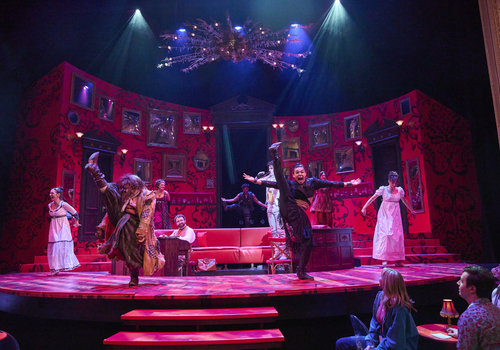 Balaga (actor, Bóe Wank*) and ensemble member (actor, Benjamin Michael Hall) take center stage during a raucous celebration in the Great Lakes Theater production of NATASHA, PIERRE & THE GREAT COMET OF 1812 at the Hanna Theatre, Playhouse Square running through October 8. Other actors featured from l to r Jessi Kirtley*, Jillian Kates*, Alex Syiek*, Dario Alvarez*, Chris McCarrell*, Jodi Dominick* and Alexa Lopez*. (Photo by Roger Mastroianni)