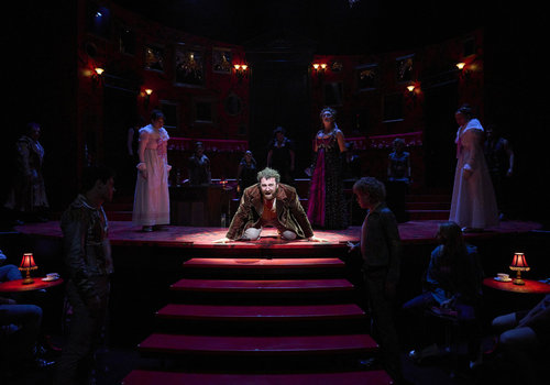Pierre (actor, Alex Syiek*) laments the current state of his life as others listen on in the Great Lakes Theater production of NATASHA, PIERRE & THE GREAT COMET OF 1812 at the Hanna Theatre, Playhouse Square, running through October 8. Other actors featured from l to r: Bóe Wank*, Chris McCarrell*, Jodi Dominick*, Jaedynn Latter, Shelby Griswold*, Jillian Kates*, Bella Serrano*, Danny Bó*, Ángela Utrera*, Jessi Kirtley* and Dario Alvarez*. (Photo by Roger Mastroianni)
