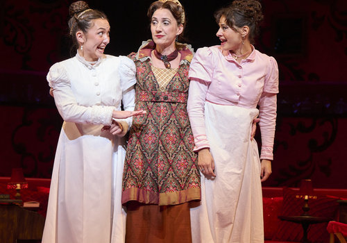 Marya (actor, Jodi Dominick*) relishes hosting her goddaughter Natasha (actor, Jessi Kirtley*) and Sonya (actor, Alexa Lopez*) in Moscow in the Great Lakes Theater production NATASHA, PIERRE & THE GREAT COMET OF 1812 at the Hanna Theatre, Playhouse Square running through October 8. (Photo by Roger Mastroianni)
