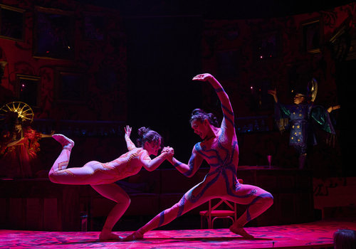 Opera Singers (actors L-R, Shelby Griswold* and Bóe Wanks*) sing as the dancers (actors l to r, Bella Serrano* and Benjamin Michael Hall) perform to their song in the Great Lakes Theater production of NATASHA, PIERRE & THE GREAT COMET OF 1812 at the Hanna Theatre, Playhouse Square running through October 8. (Photo by Roger Mastroianni)