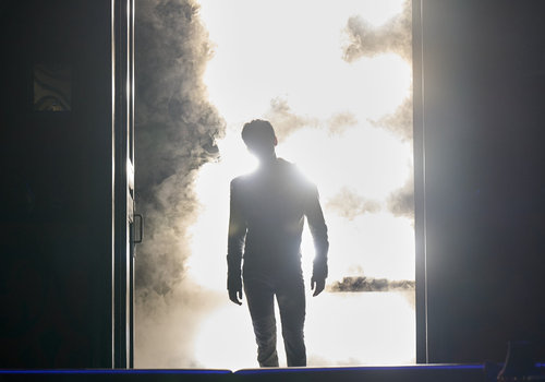 Pierre (actor, Alex Syiek*) takes center stage as the story concludes in the Great Lakes Theater production NATASHA, PIERRE & THE GREAT COMET OF 1812 at the Hanna Theatre, Playhouse Square, running through October 8. (Photo by Roger Mastroianni)