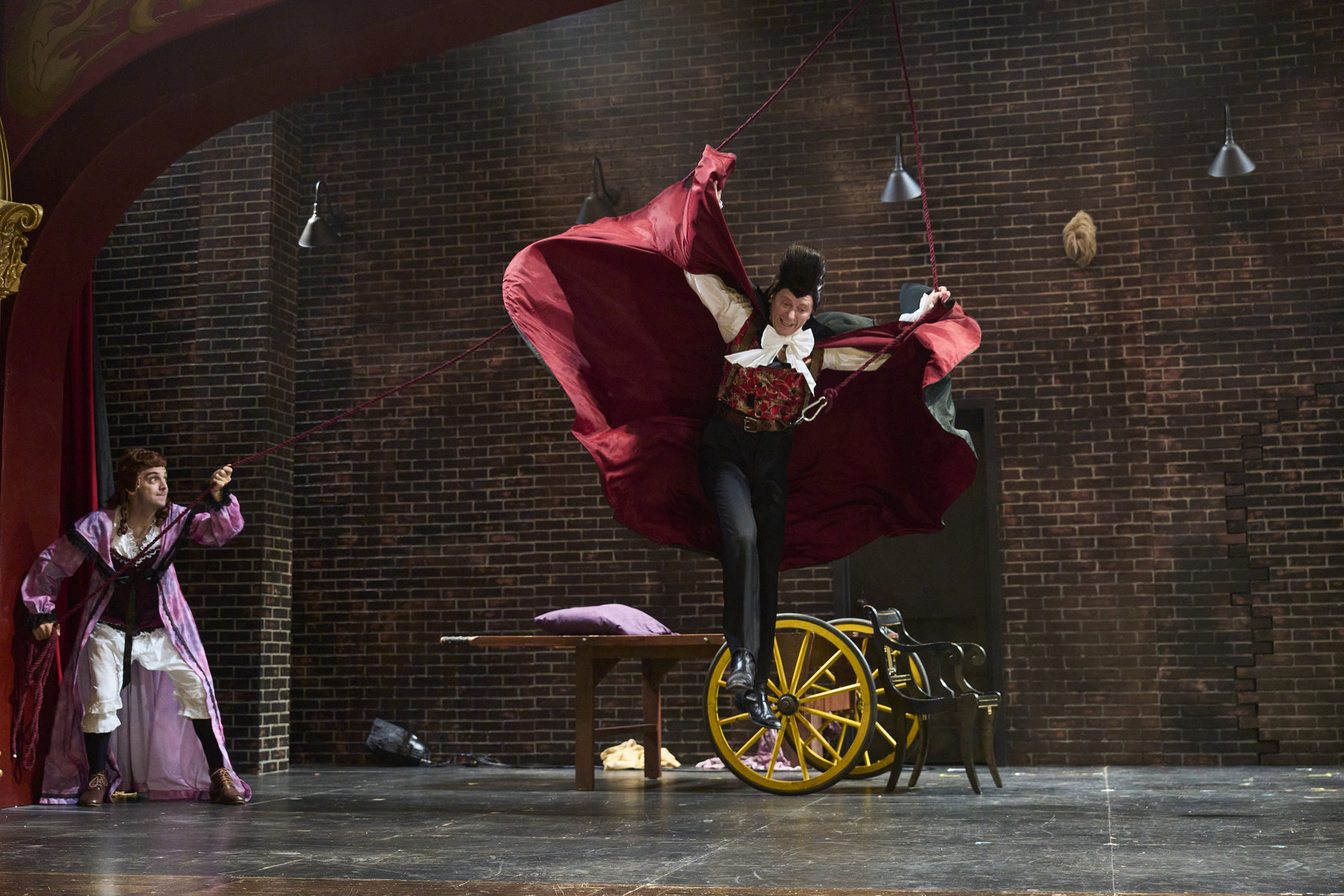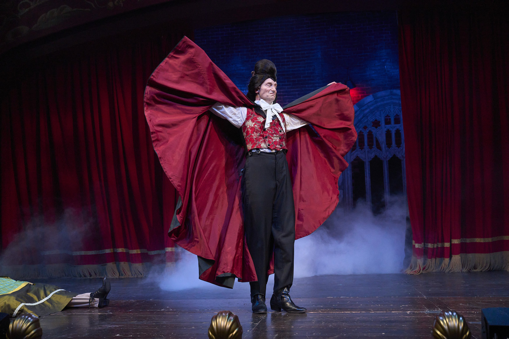 Actor 4, dressed as Lucy (actor, Joe Wegner*), gives an assist to Dracula (actor, Jeffrey C. Hawkins*) to portray the graceful flight of this master villain in the Great Lakes Theater production of Dracula: The Bloody Truth at the Hanna Theatre, Playhouse Square running through November 5. (Photo by Roger Mastroianni)