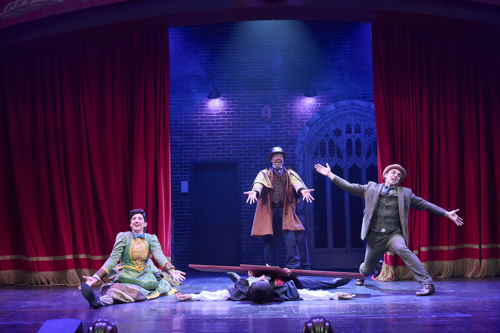 Mina (actor, Jodi Dominick*), Van Helsing (actor, Lynn Robert Berg*) and Harker (actor, Joe Wegner*) celebrate the victory over Dracula (actor, Jeffrey C. Hawkins*) in the Great Lakes Theater production of Dracula: The Bloody Truth at the Hanna Theatre, Playhouse Square running through November 5. (Photo by Roger Mastroianni)