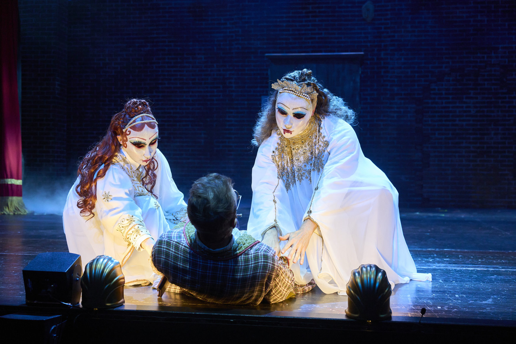 Dracula's Brides (actors l to r, Jodi Dominick* and Lynn Robert Berg*) encounter Jonathan (actor, Joe Wegner*) as he explores the castle in the Great Lakes Theater production of Dracula: The Bloody Truth at the Hanna Theatre, Playhouse Square running through November 5. (Photo by Roger Mastroianni)