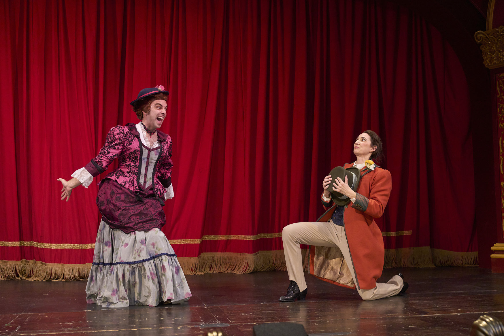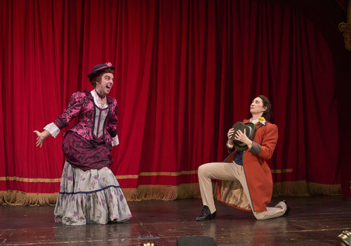 Lucy (actor, Joe Wegner*) is excited to accept the proposal of her suitor, Arthur Holmwood (actor, Jodi Dominick*), in the Great Lakes Theater production Dracula: The Bloody Truth at the Hanna Theatre, Playhouse Square, running through November 5. (Photo by Roger Mastroianni)